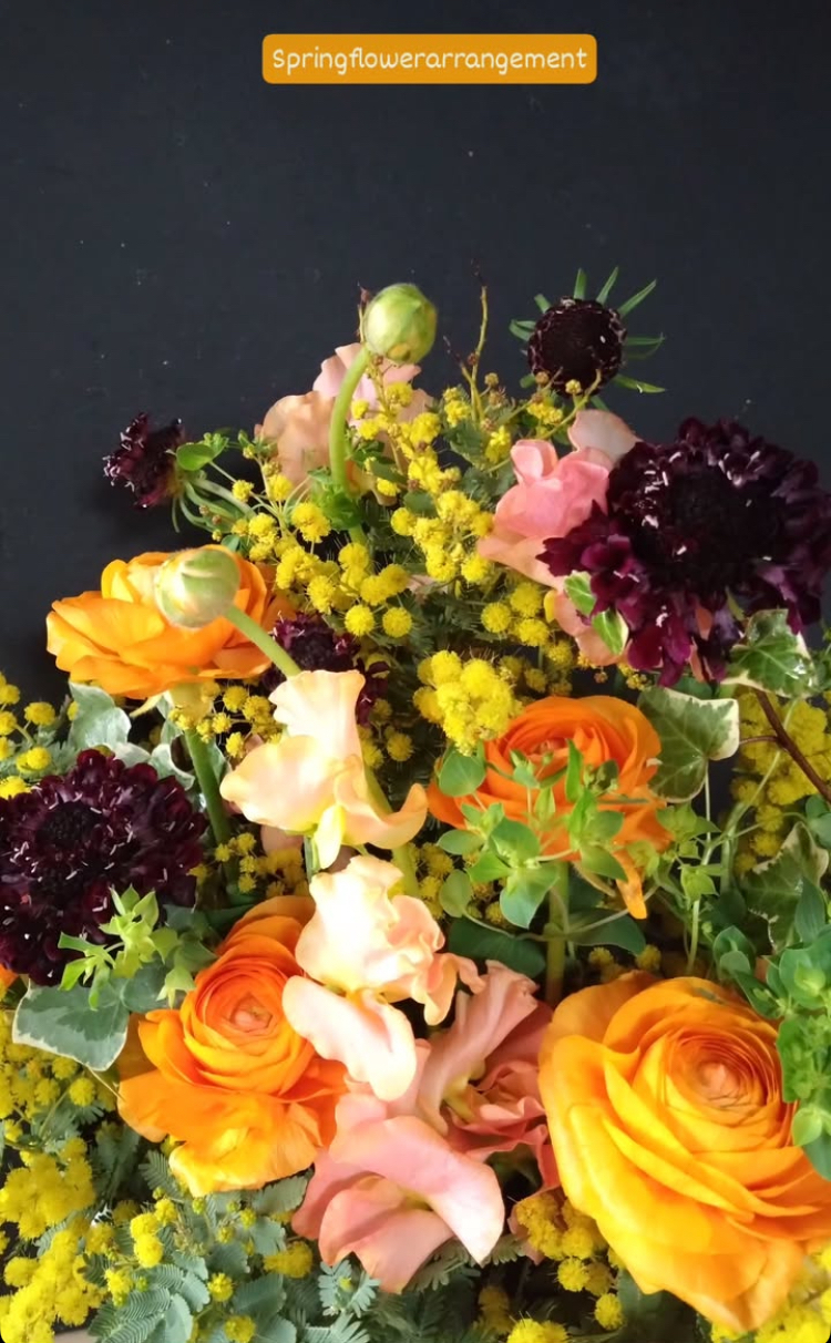 黄色のミモザと春の花々。春がいっぱいです!ミモザの黄色と春の花々のオレンジが鮮やかで、グリーンも美しく映してくれます。