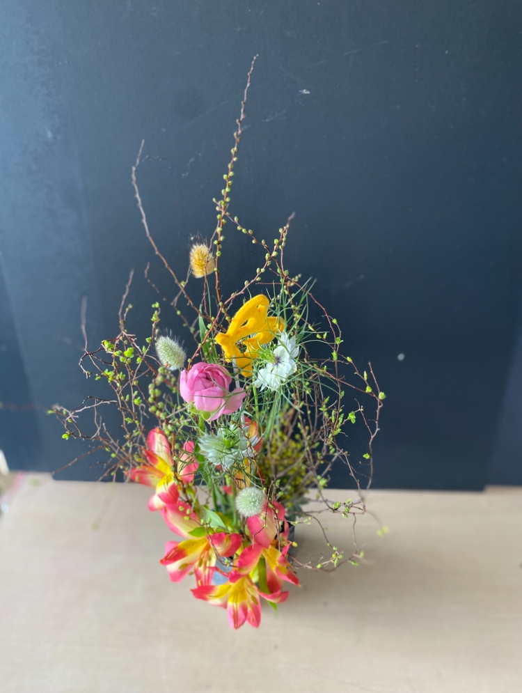 少しの花材で春を作ろう!小さなアレンジメントでも、ちょこんとおけばそこは春。レッスンで作った小さな春です。