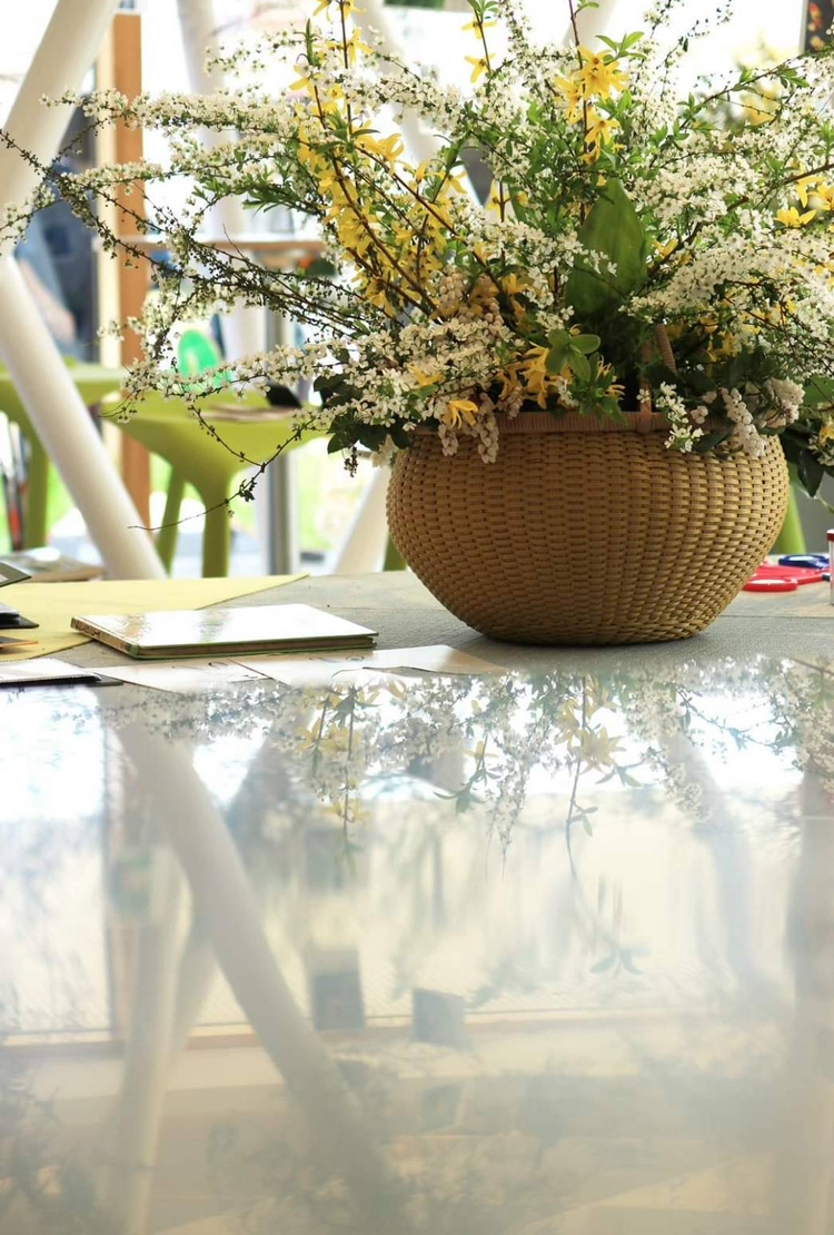大きなテーブルにのびやかに生けたユキヤナギやレンギョウ。器がかご。一層ナチュラルに感じられます。