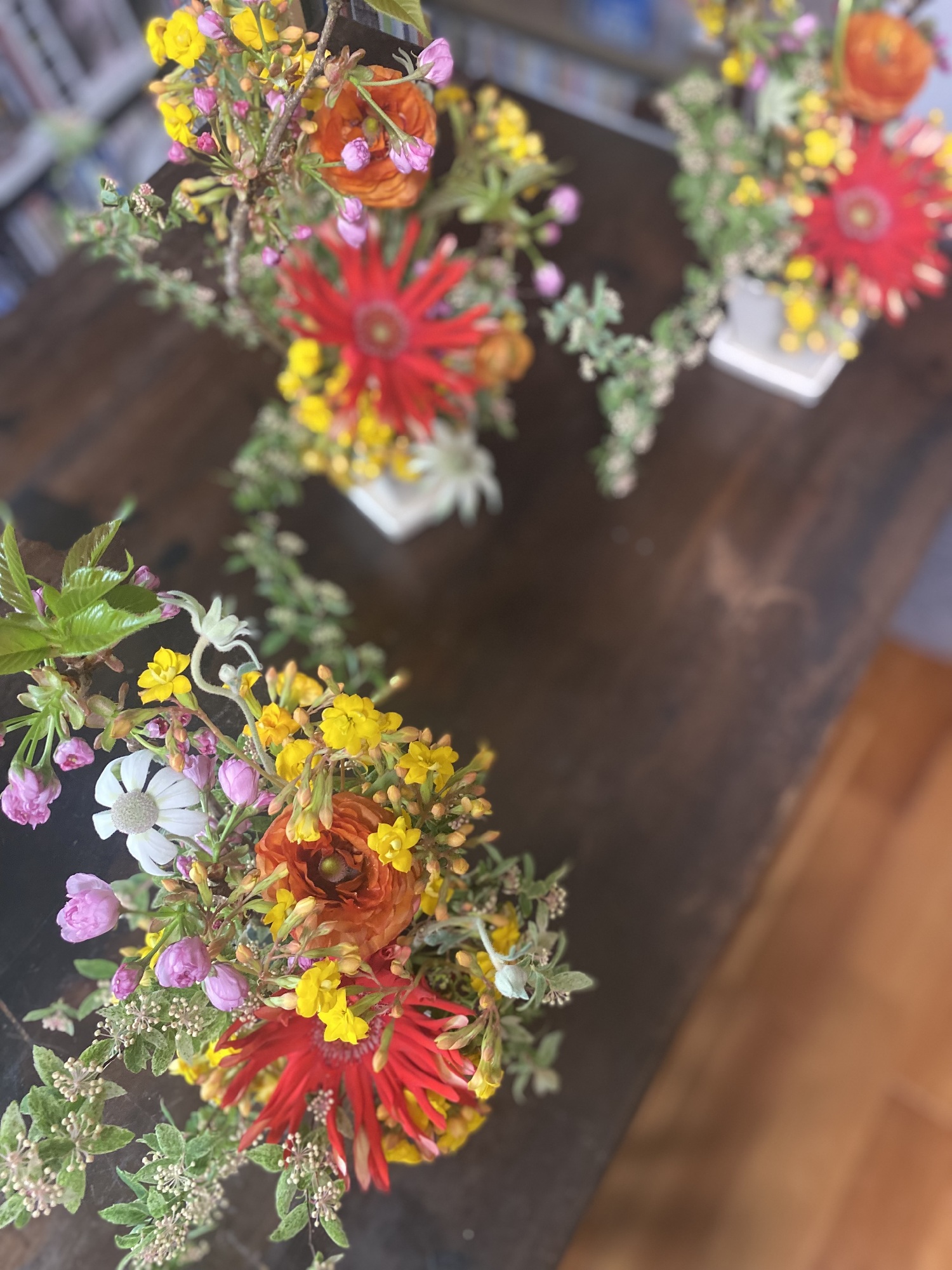 チャーミングなヒラヒラの花びらの、ガーベラ背の高い黄色のカランコエ、こでまりや桜もプラスしたミニアレンジレッスン。