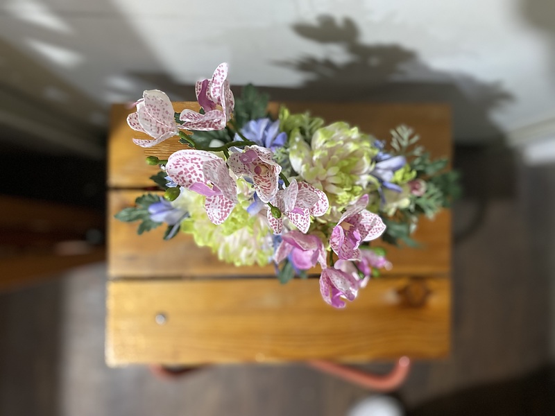 お気持ちだけでも届けたいと、小さなお花をお作りしました。お世話の不要なアーティフィシャルフラワーでコンパクトなアレンジメント。