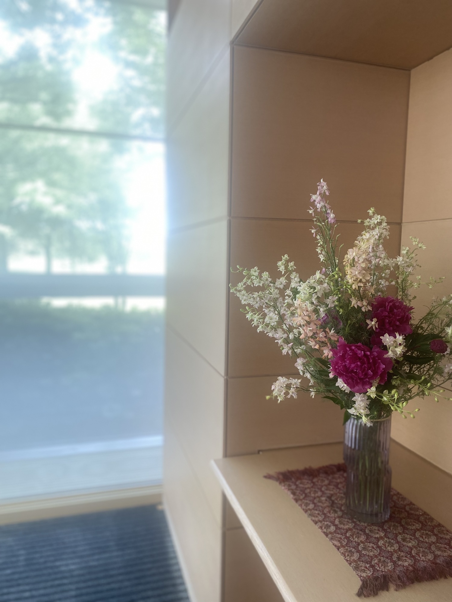 つぼみが膨らみ始めるとあっという間に見事に開く芍薬。旬の今、オフィスに飾る。