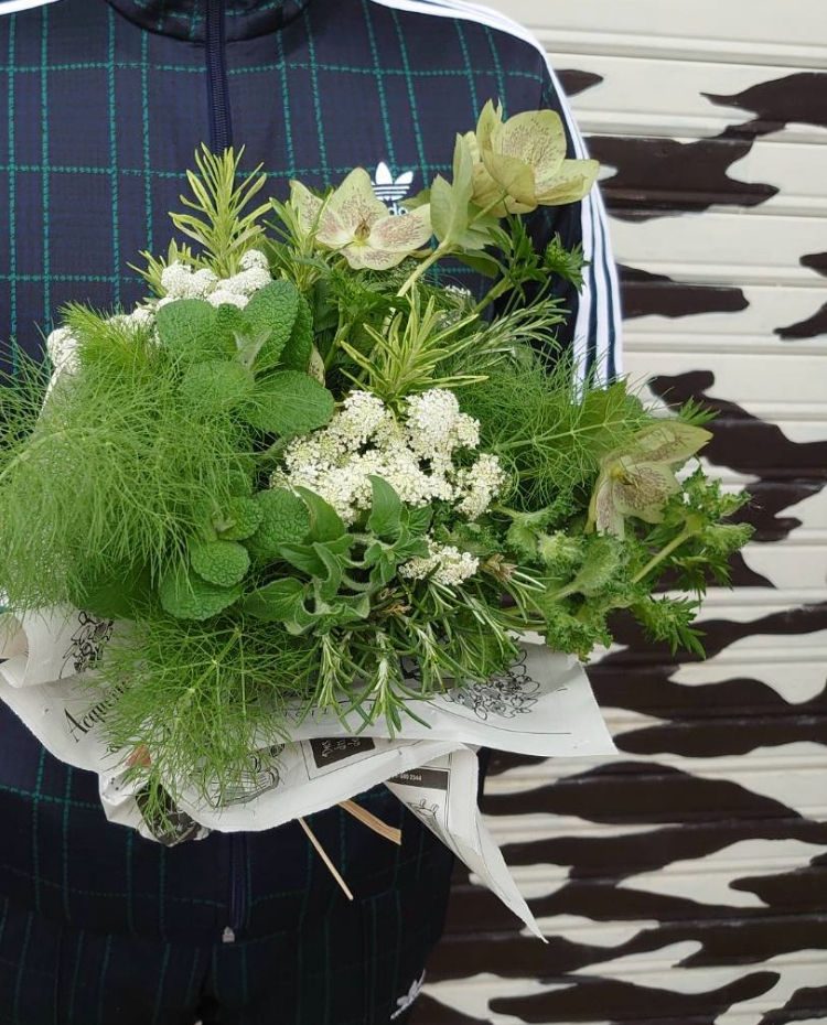 フェンネル、ローズマリー、フリルミントやいろいろミント等々香里を束ねて贈ります。クリスマスローズとハーブたっぷりの花束。