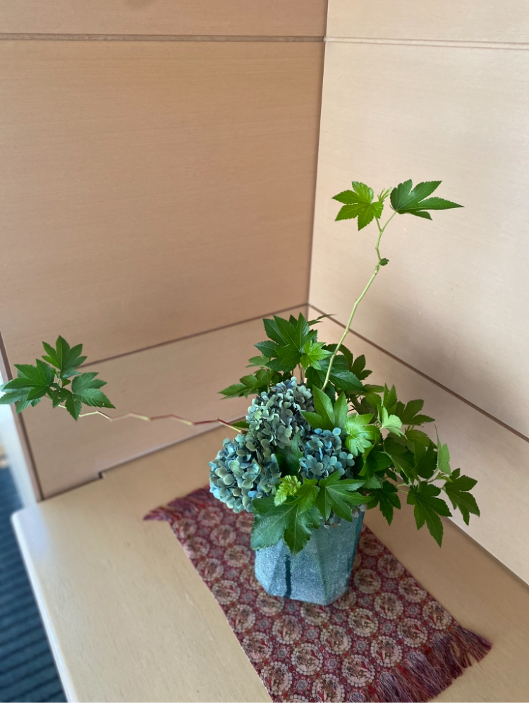 紫陽花がちょうどみずみずしい時期、ベビーハンズの葉で遊んで活けてみました