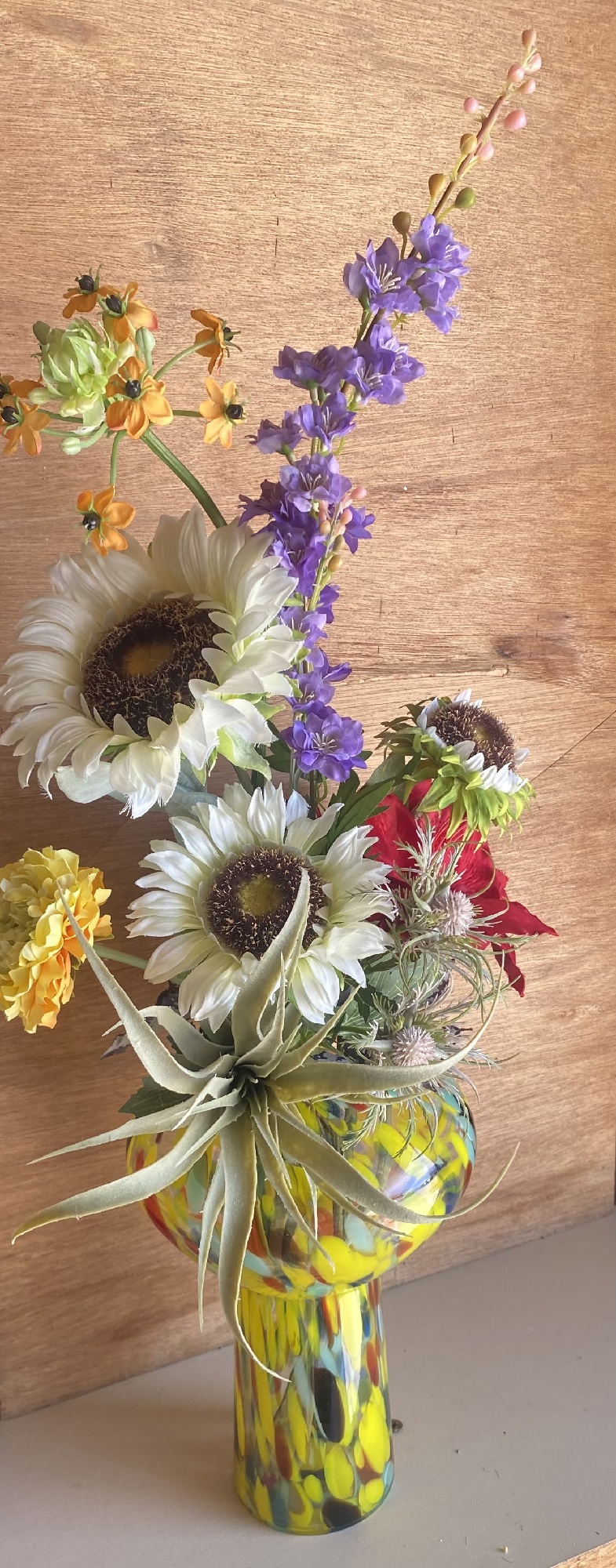 ガラスの器に混ざり込んでいるいろんな色を使って花をチョイスしてまるで絵のように遊んでみました(^^)