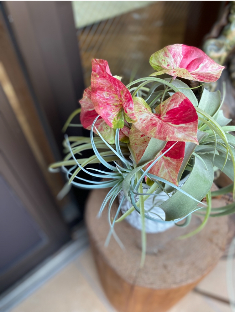 小さなアーティフィシャルフラワーアレンジ。バーバーショップ入り口のディスプレイ。ミニマムだけれど夏たっぷりに。