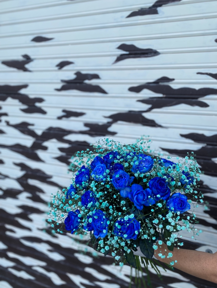 バラとかすみ草を染めて、鮮やかなサマーブルーに。ブルーがテーマカラー!という方へのプレゼント。