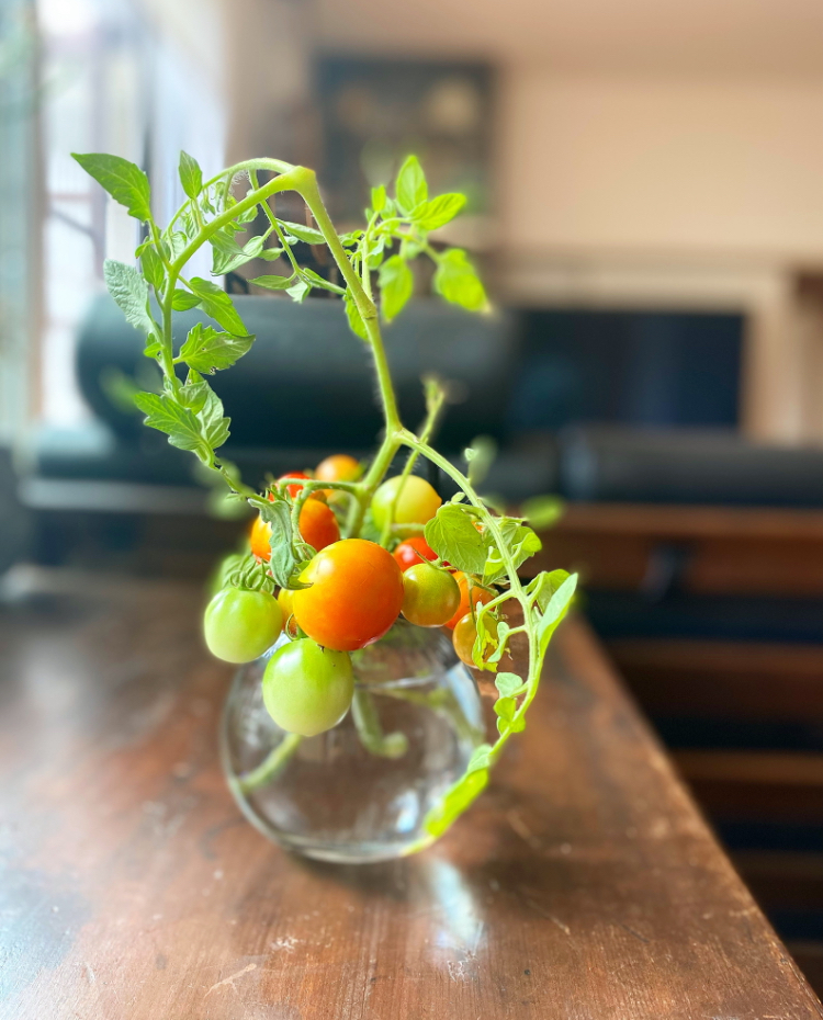 フレッシュなミニトマトを枝ごとカットして、まだ青くてツヤツヤした姿も愛でる。花だけじゃない野菜も美しい!