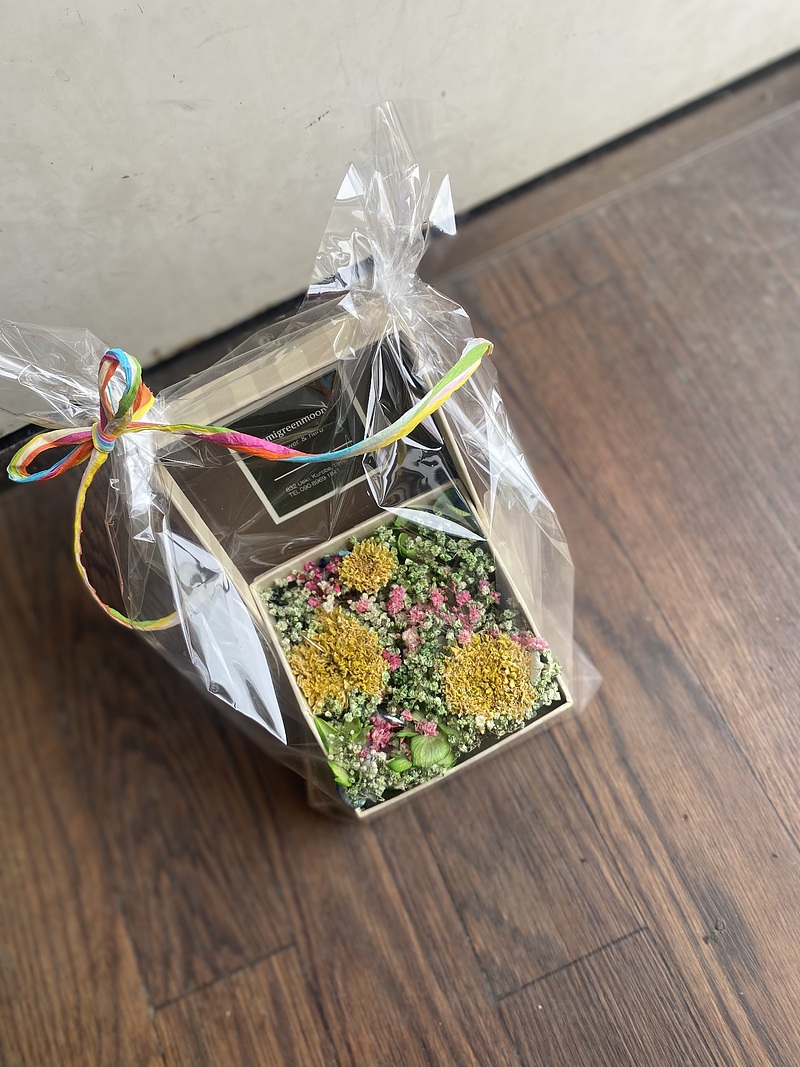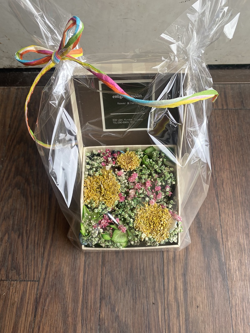 可愛らしいボックスにグリーンのかすみ草をたっぷりつめこんで。イエローのマリーゴールドの愛らしいドライフラワーが祝福しているよう!