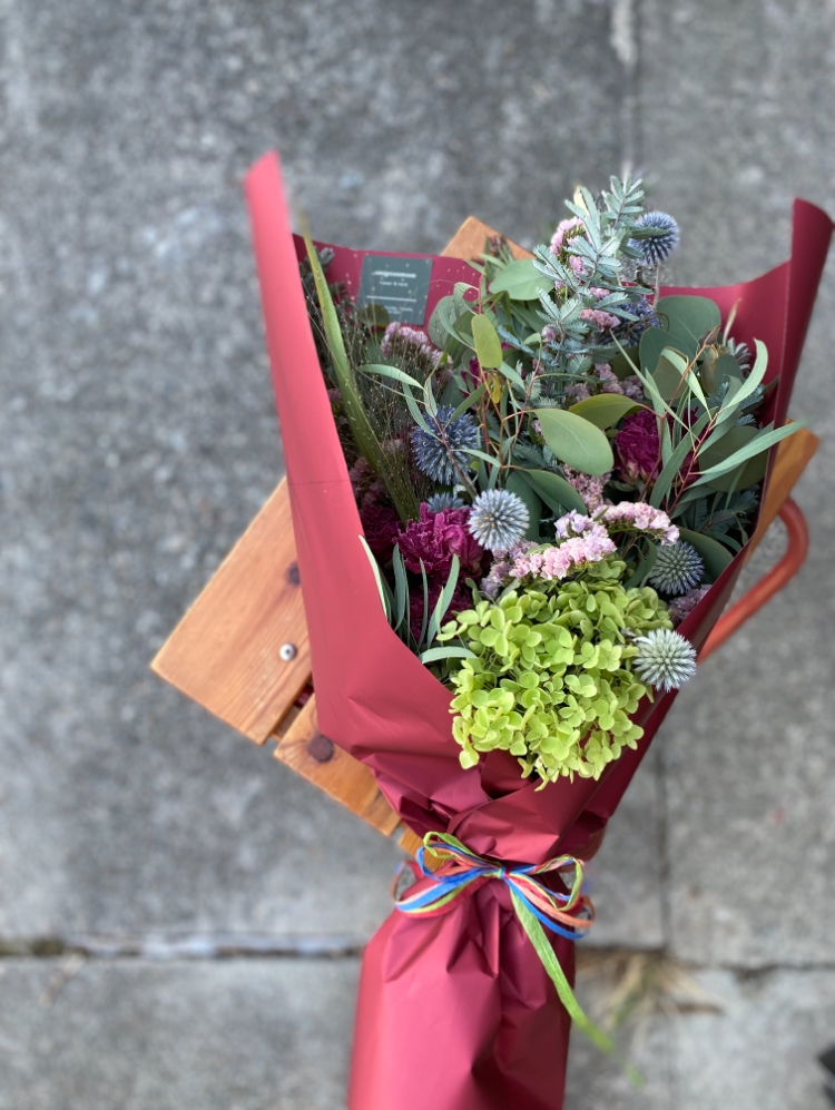 生花はなかなか持たない季節ということもあり、少しでも長く楽しんでほしいと、ドライブフラワーの花束を。