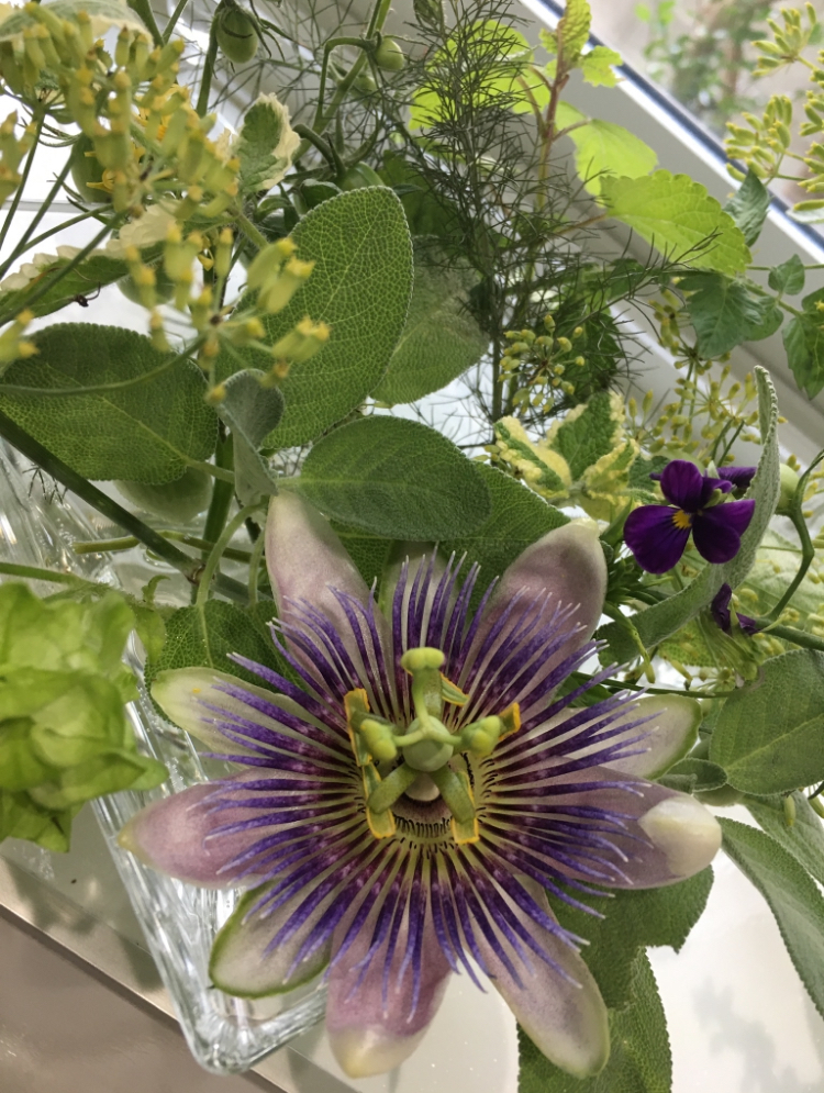 この暑さにもめげずに咲いてくれる美しい花のひとつに時計草があります。あまりに美しいのでドアップでパチリ!