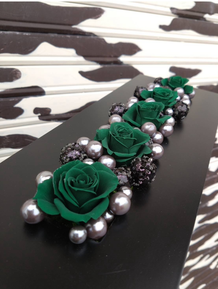 シルバーを強調して、合わせるお花のカラーは深いグリーン。大人モダンな空間に似合うお花のプレゼントです。