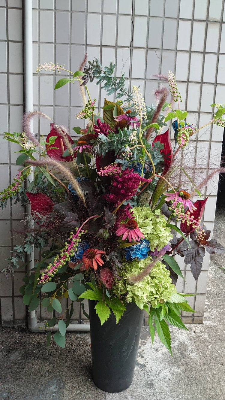 やまごぼうやアマランサス、エキナセア等々また夏の暑さに耐えられるお花たちでアレンジメントを。お店のオープンをお祝いして。