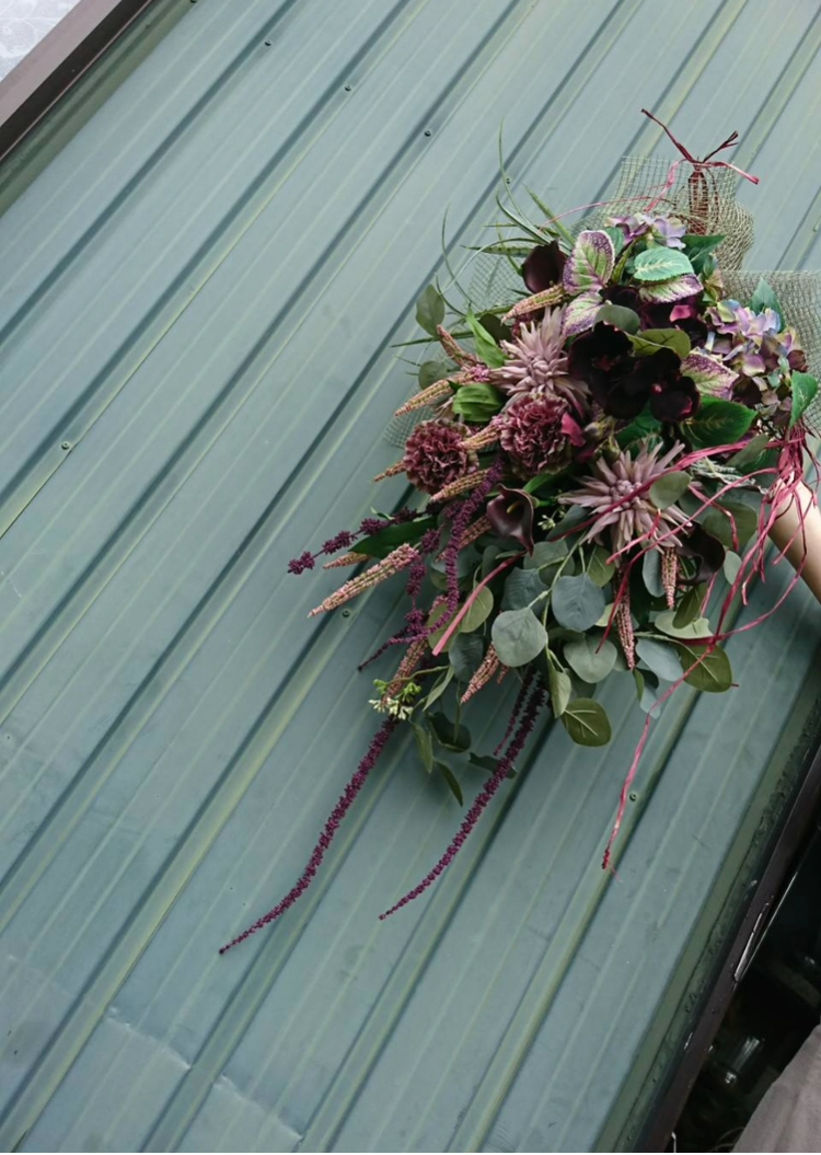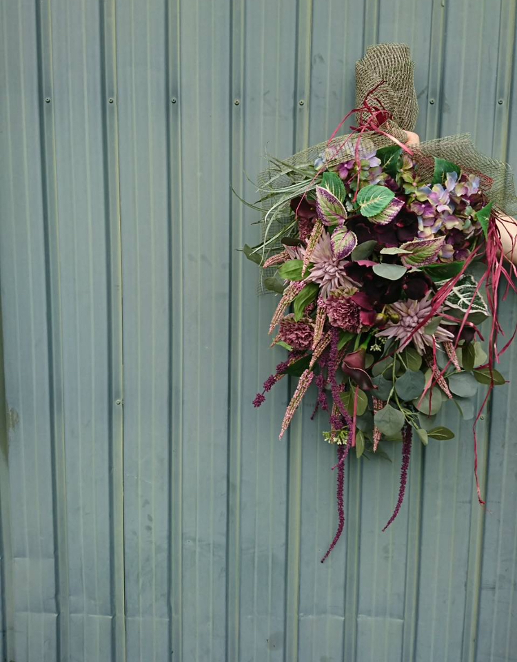 この季節ならではの色。今の空気感をイメージできる色。そんな植物をチョイスしながら秋色スワッグをプレゼント用に作成しました。