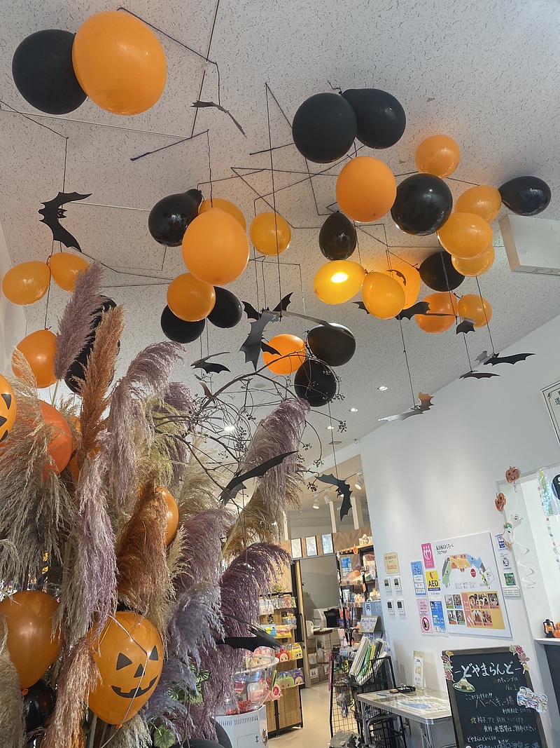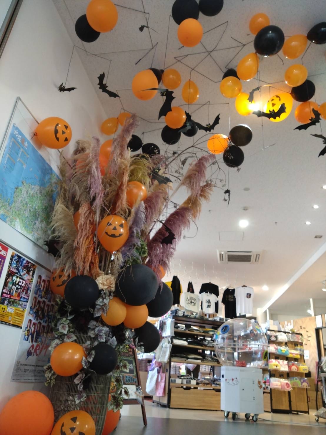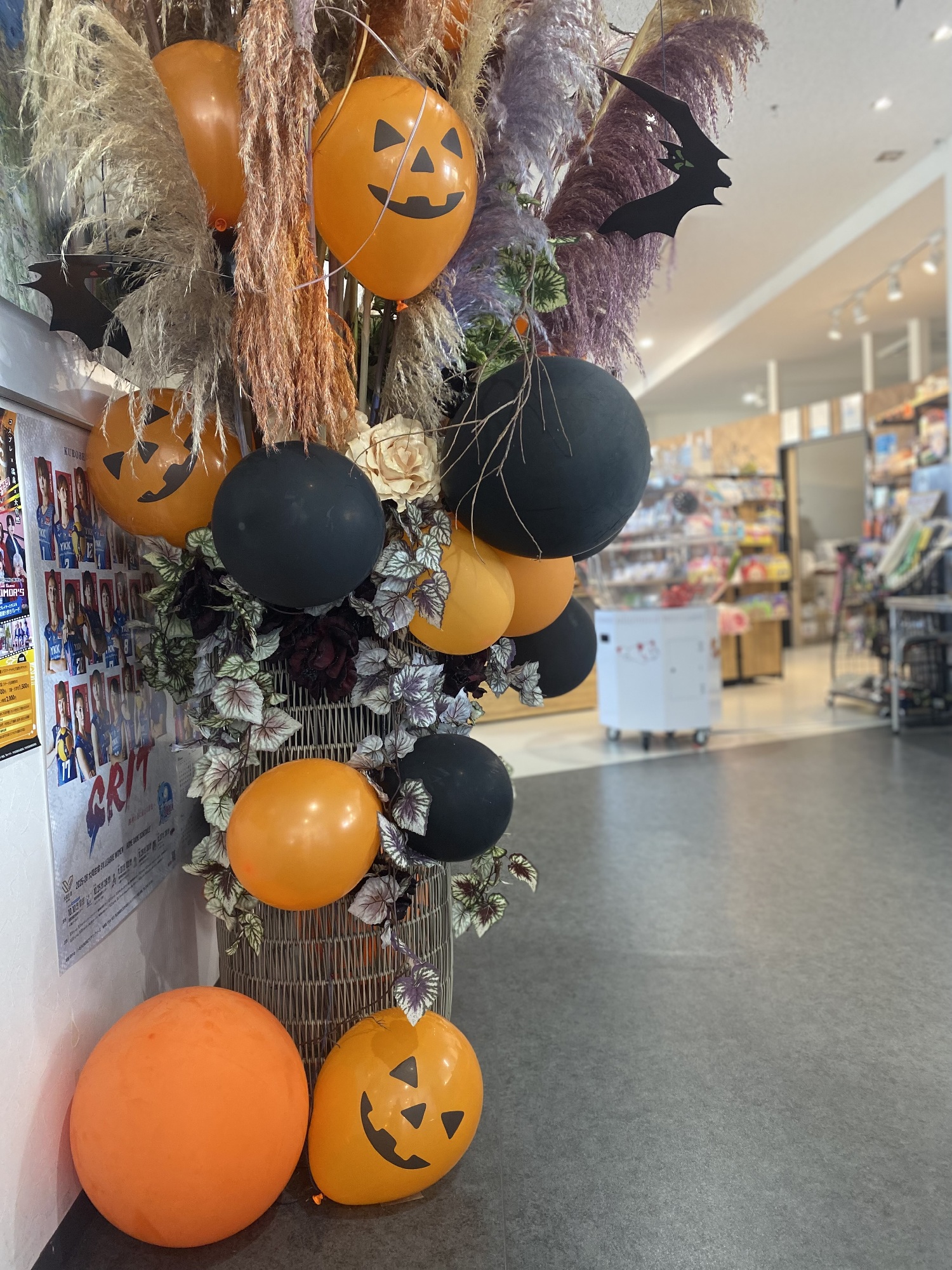 道の駅KOKOくろべ。正面入り口のハロウィンディスプレイを担当させていただきました!秋のイベント!パンパスグラスで秋らしさをプラスしてハロウィン風船で遊んで!