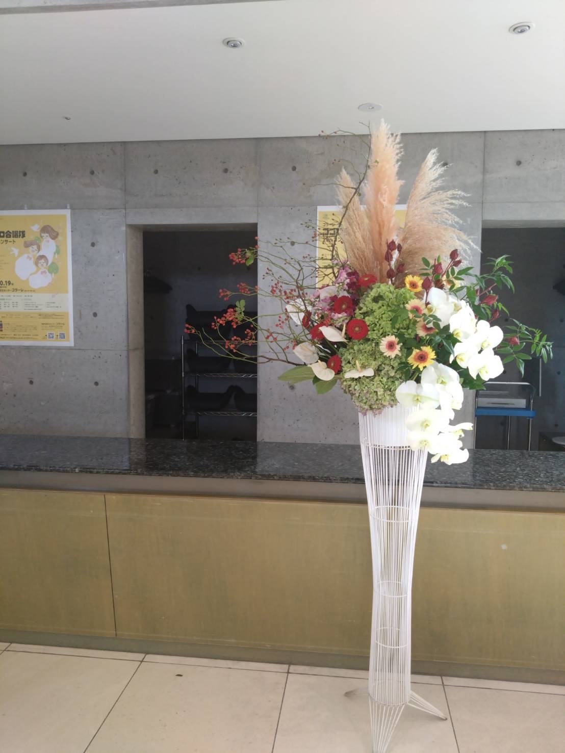 真っ白な胡蝶蘭と、白いスタンド。秋らしいパンパスとの新鮮な調和。お祝いスタンド花です。