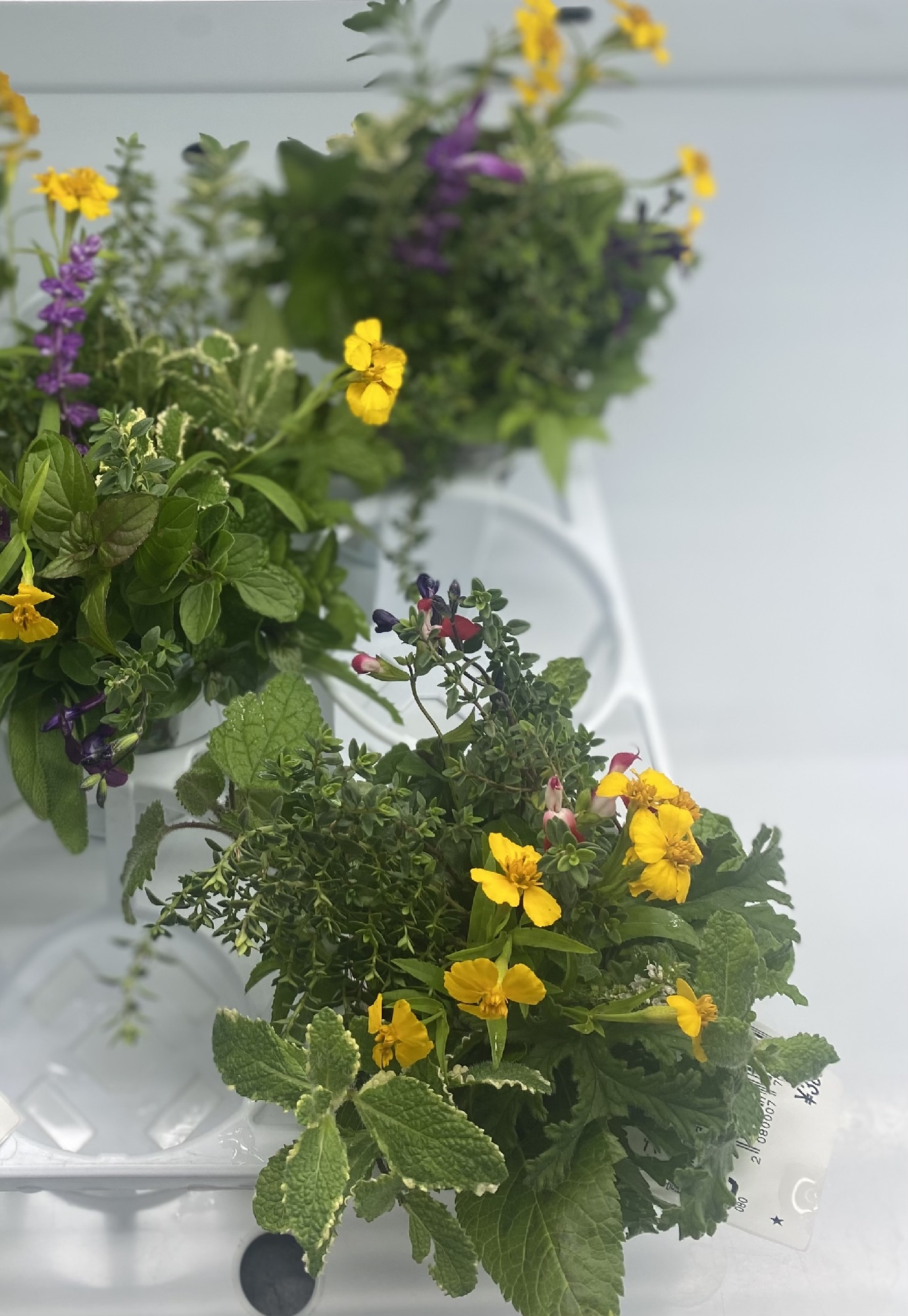 レモンマリーゴールドのオレンジイエローの小さな花やセージの紫色の花がかわいらしいのです。
