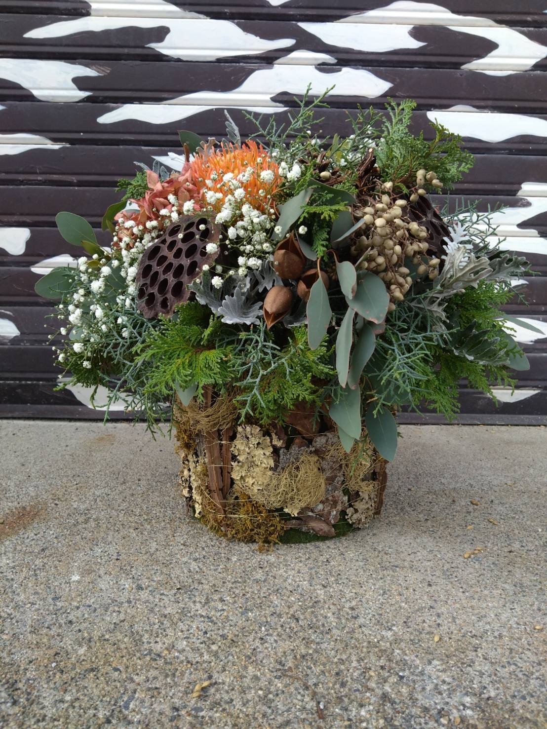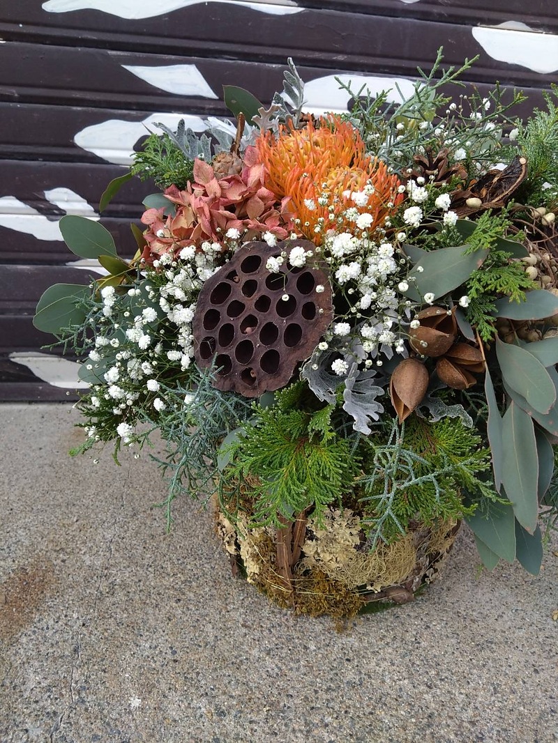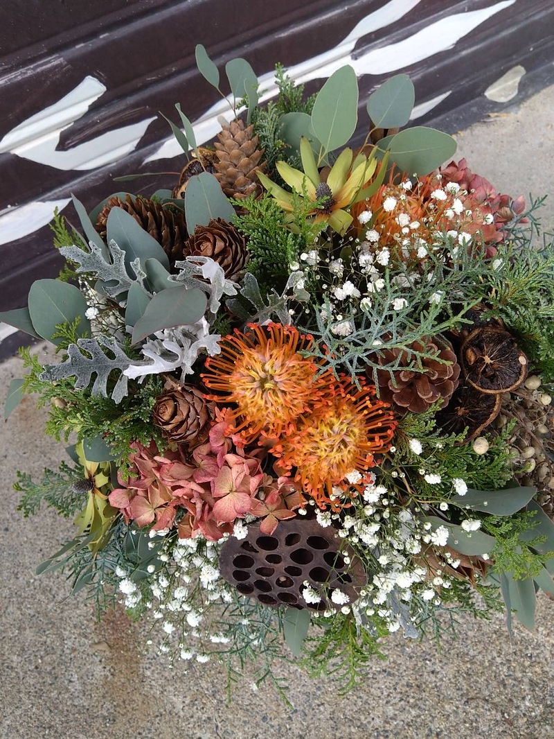数種のグリーン、ピンクッションとポンポンした白いかすみ草や実物をたっぷり入れたラウンドアレンジになりました。