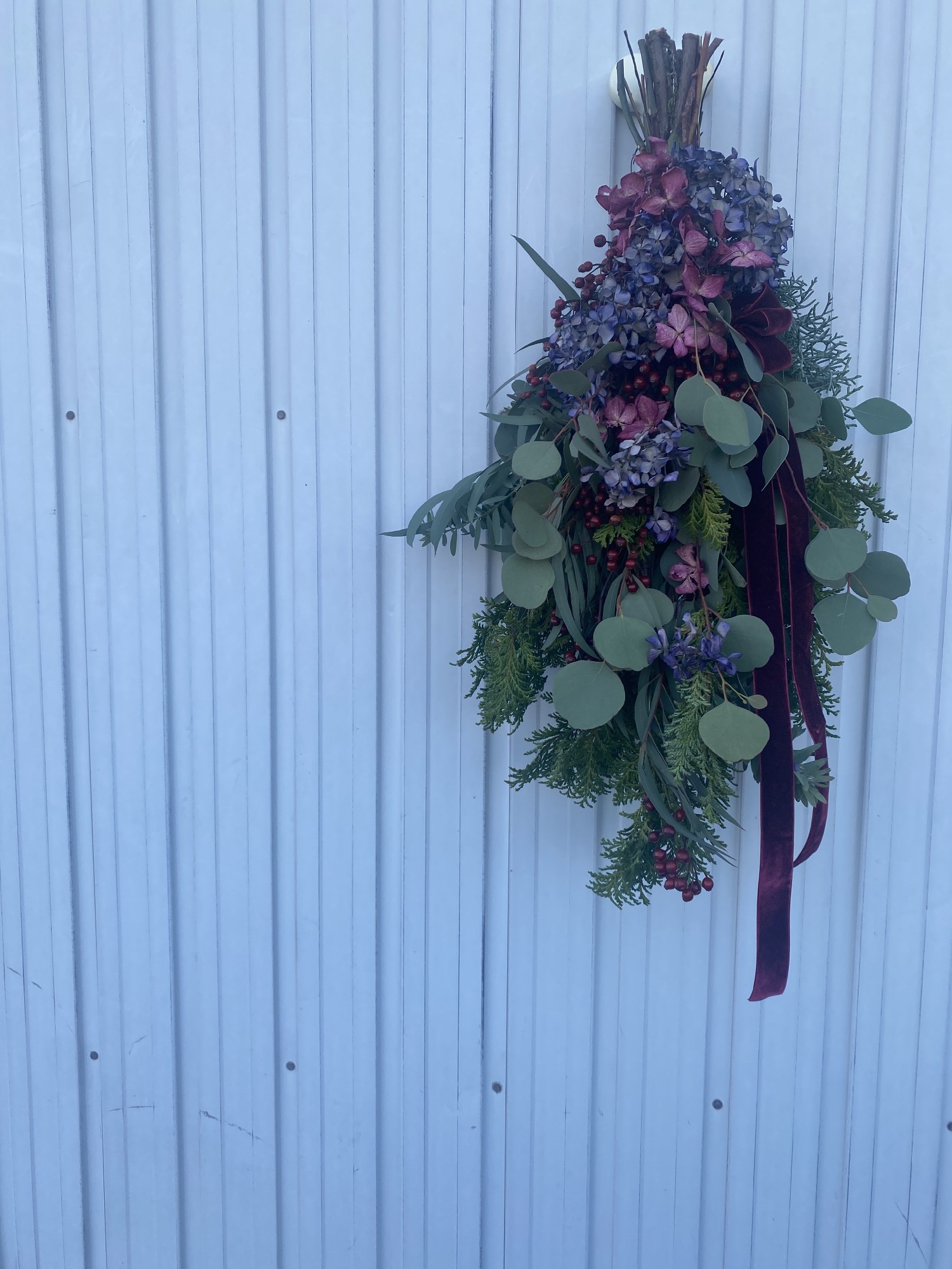 ヒバ、ポポラスユーカリ、ブルーアイス、細葉ユーカリ等々を束ねたスワッグ。暖かみを感じる深いレッドのビロードリボンでランクアップ!
