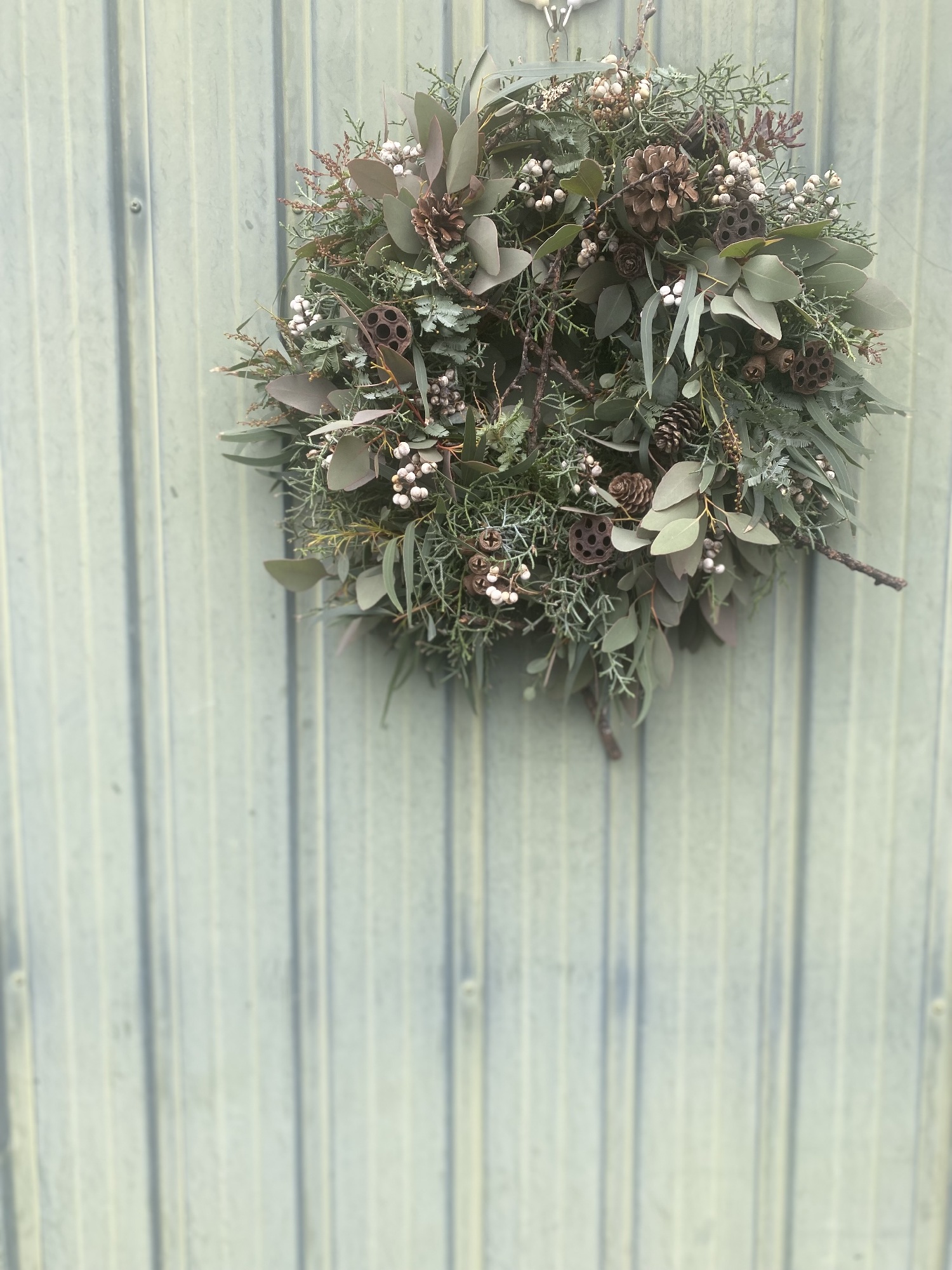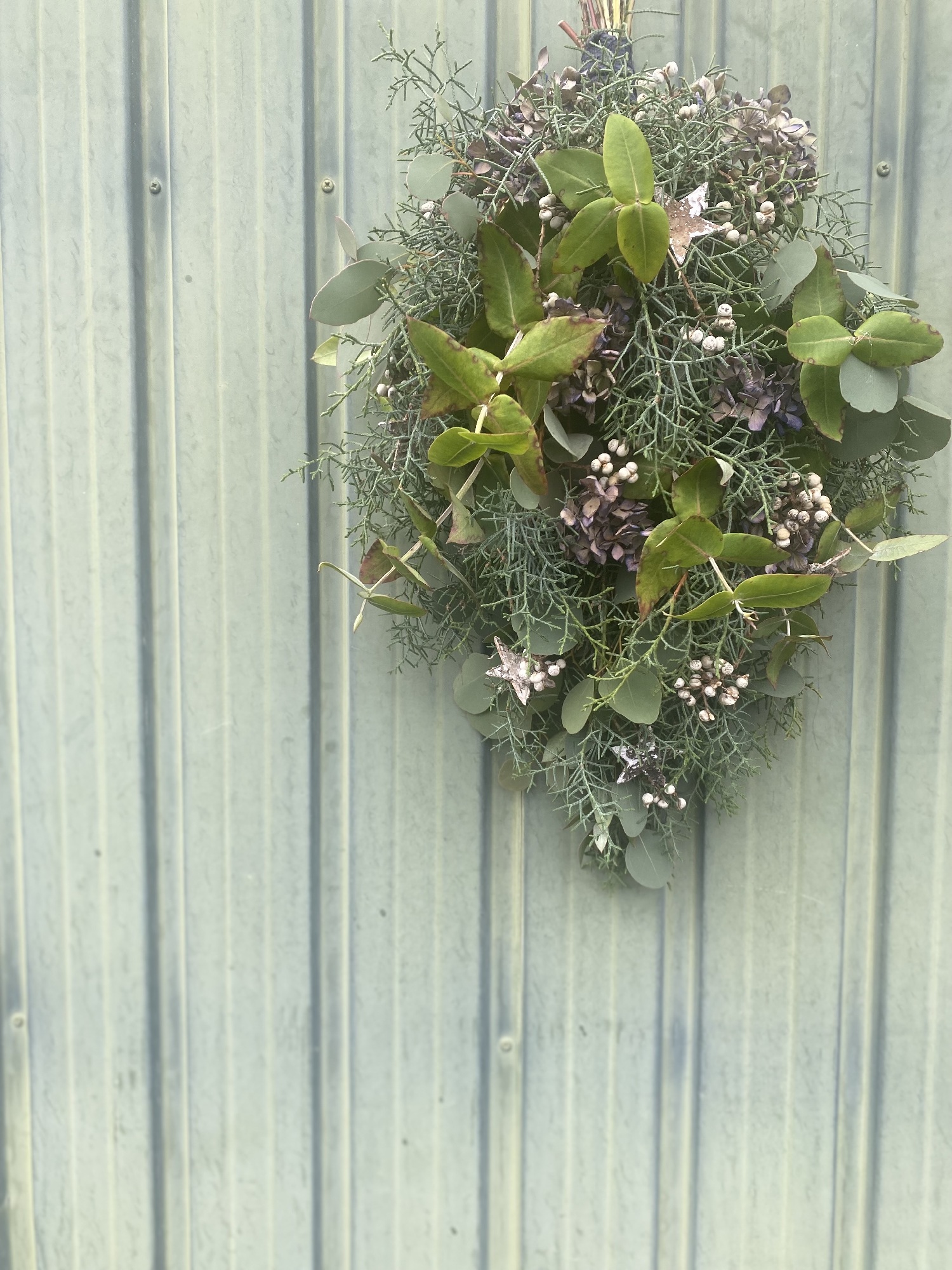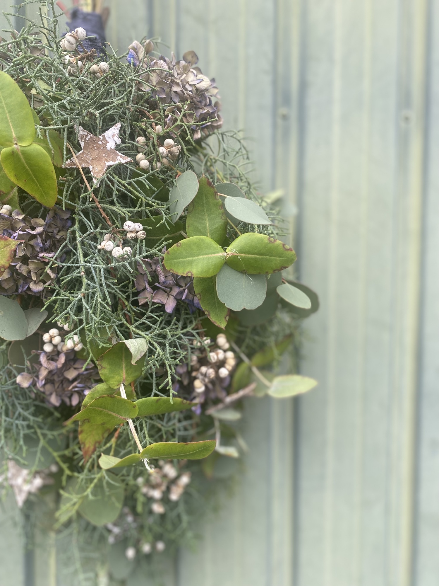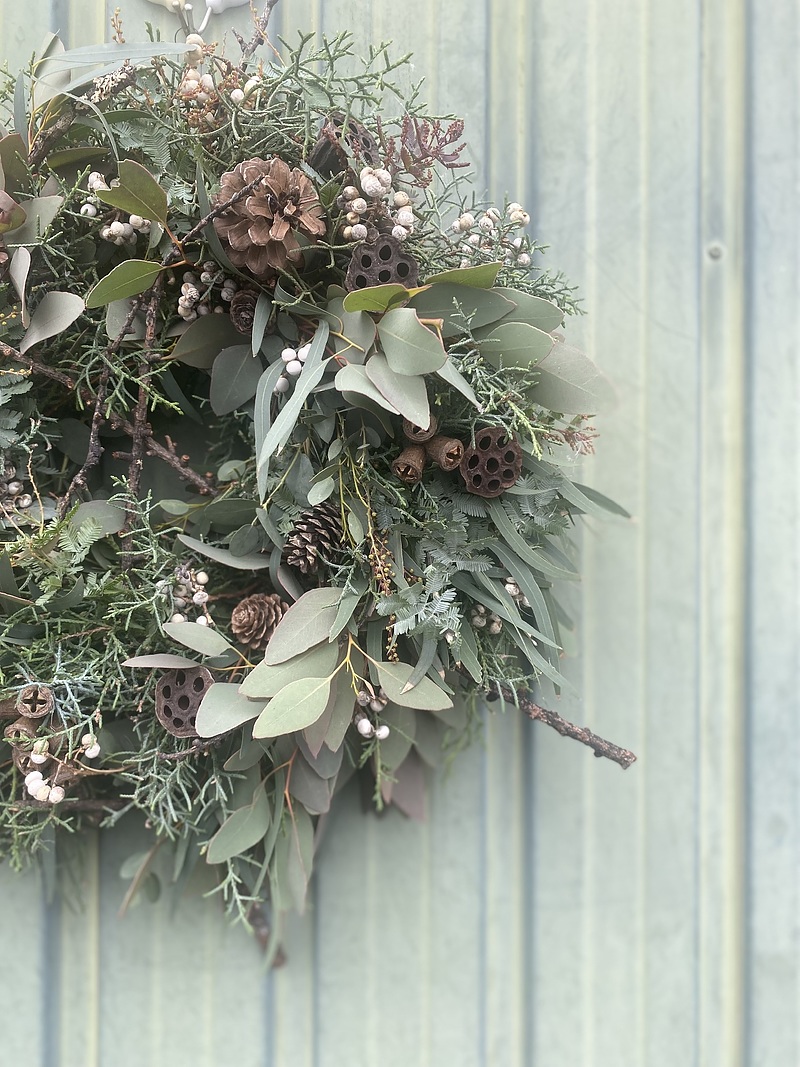 クリスマスの贈り物。リースとスワッグ。ナチュラルなグリーンや木の実、枝、ナンキンハゼを。