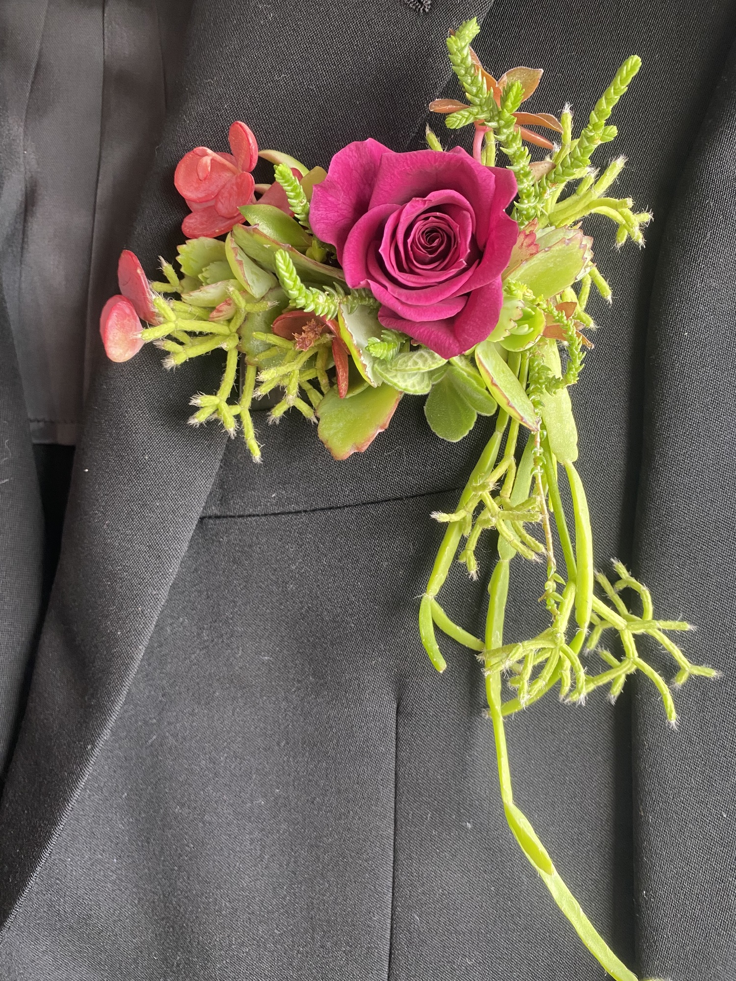 男性の方が胸ポケットにつけるコサージュ。紫色のバラと多肉植物のグリーンを組み合わせて。晴れの日スタイルの完成です。