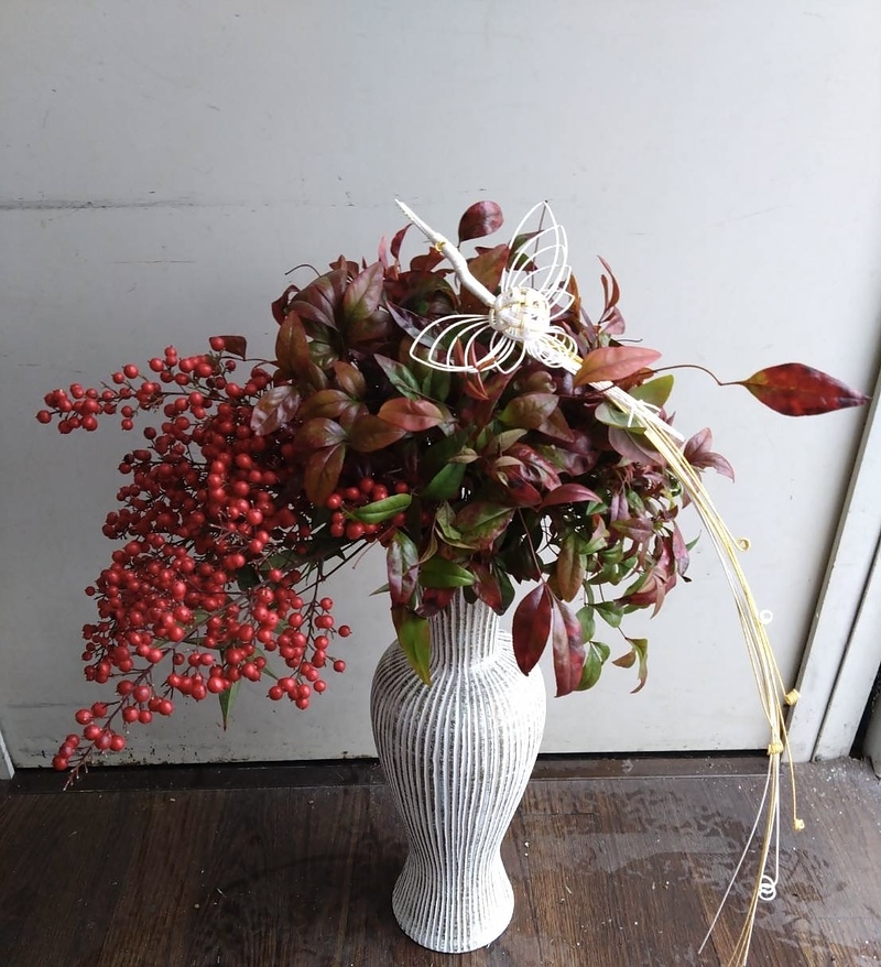 今年は、お正月飾りにも、おたふく南天の赤い葉色がよく使われていました。生け込みはこんな風に。