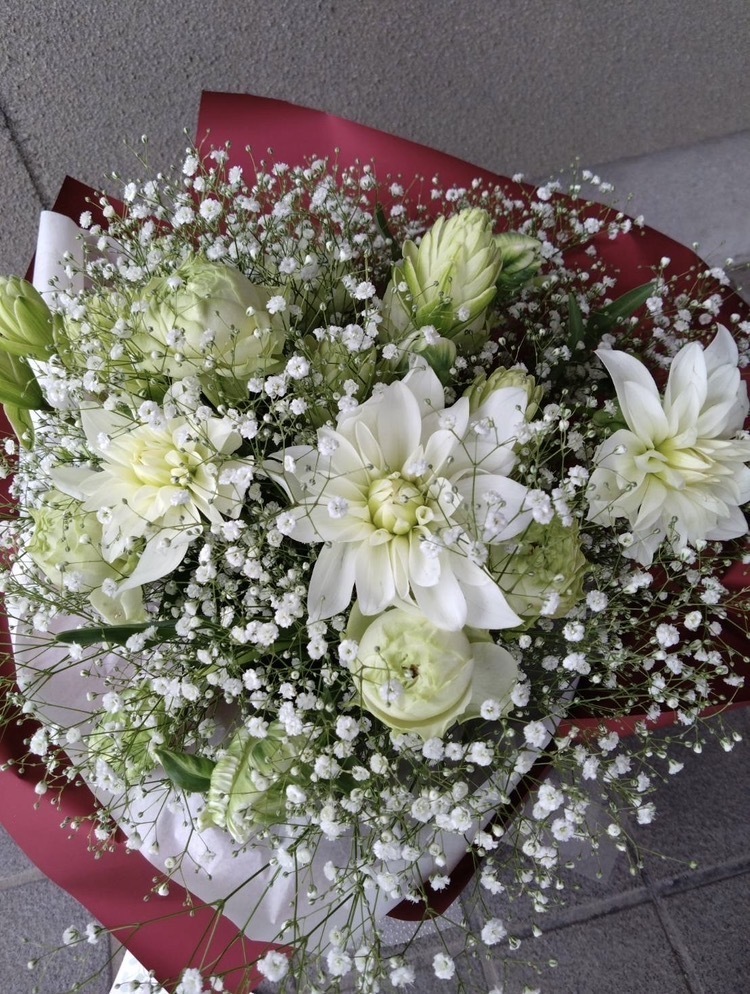 真紅に包まれた真っ白なお花。晴れの成人祝いのお花です。