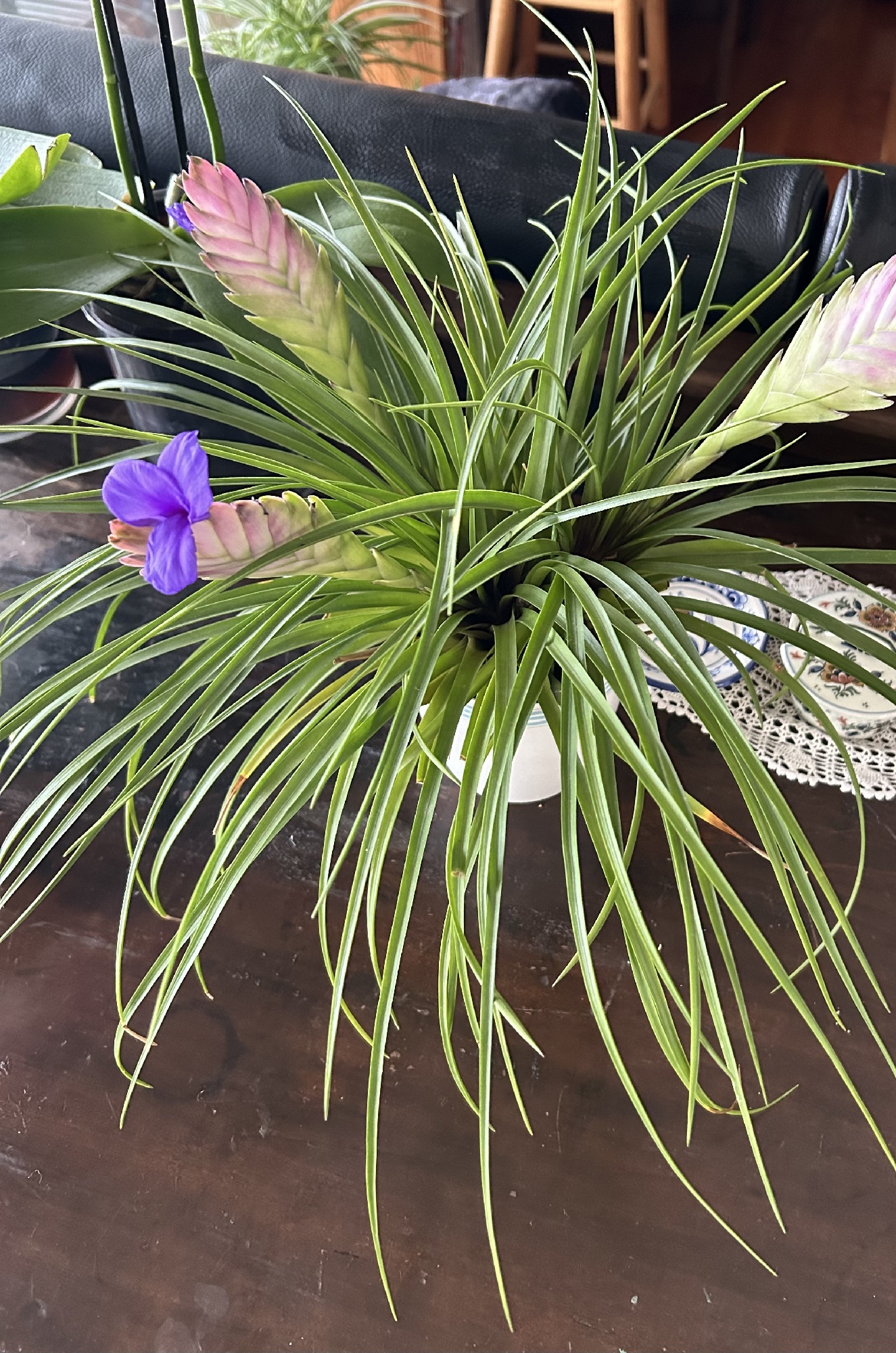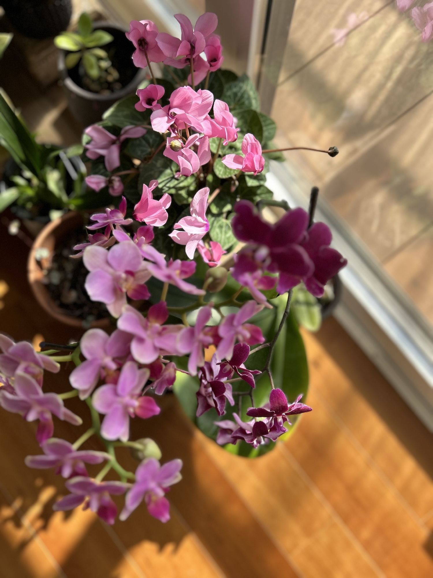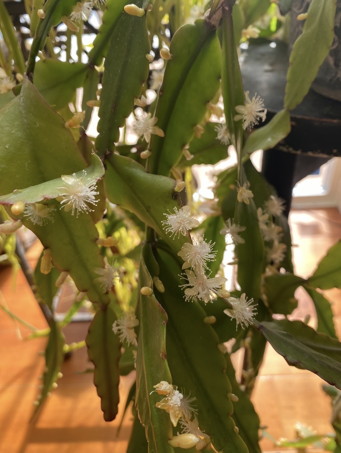 雪の花。外は真っ白。室内ではこんなに鮮やかに花たちが咲いています。リプサリスの小さな白い花小ぶりの蘭やシクラメンたちの鮮やかな花たちハナアナナスの目を引く紫色の小さな花
