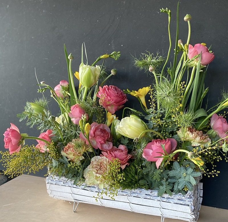 レモンイエローとピンクのラナンキュラスにフリージアやミモザ。蝶がひらひらと舞い降りてくれそう…春開くアレンジメント。