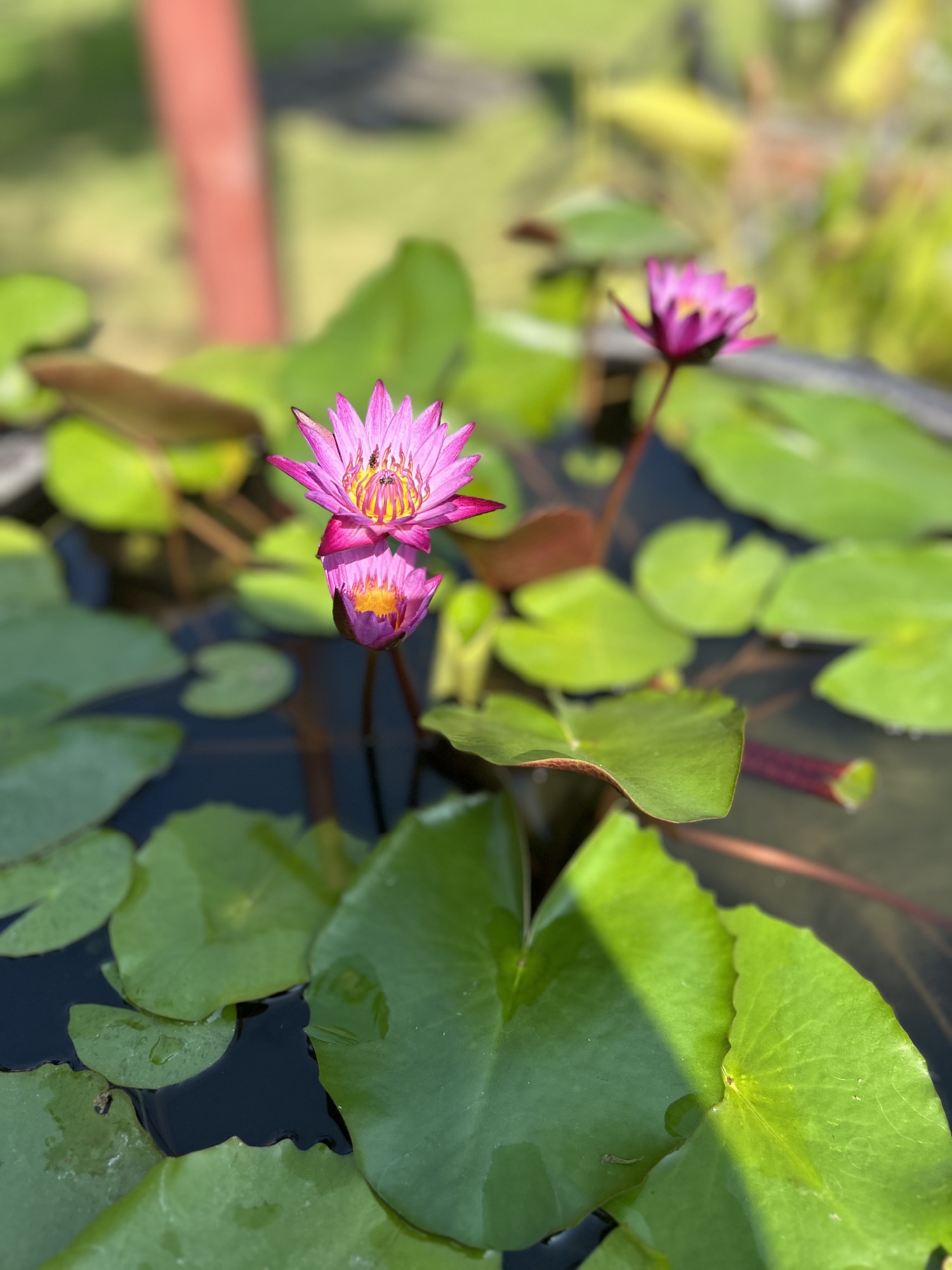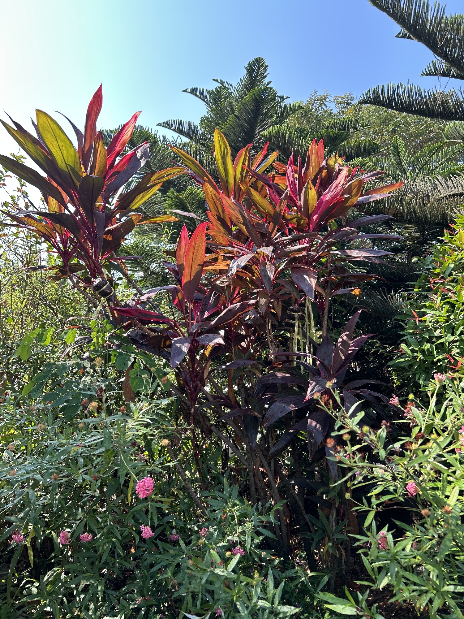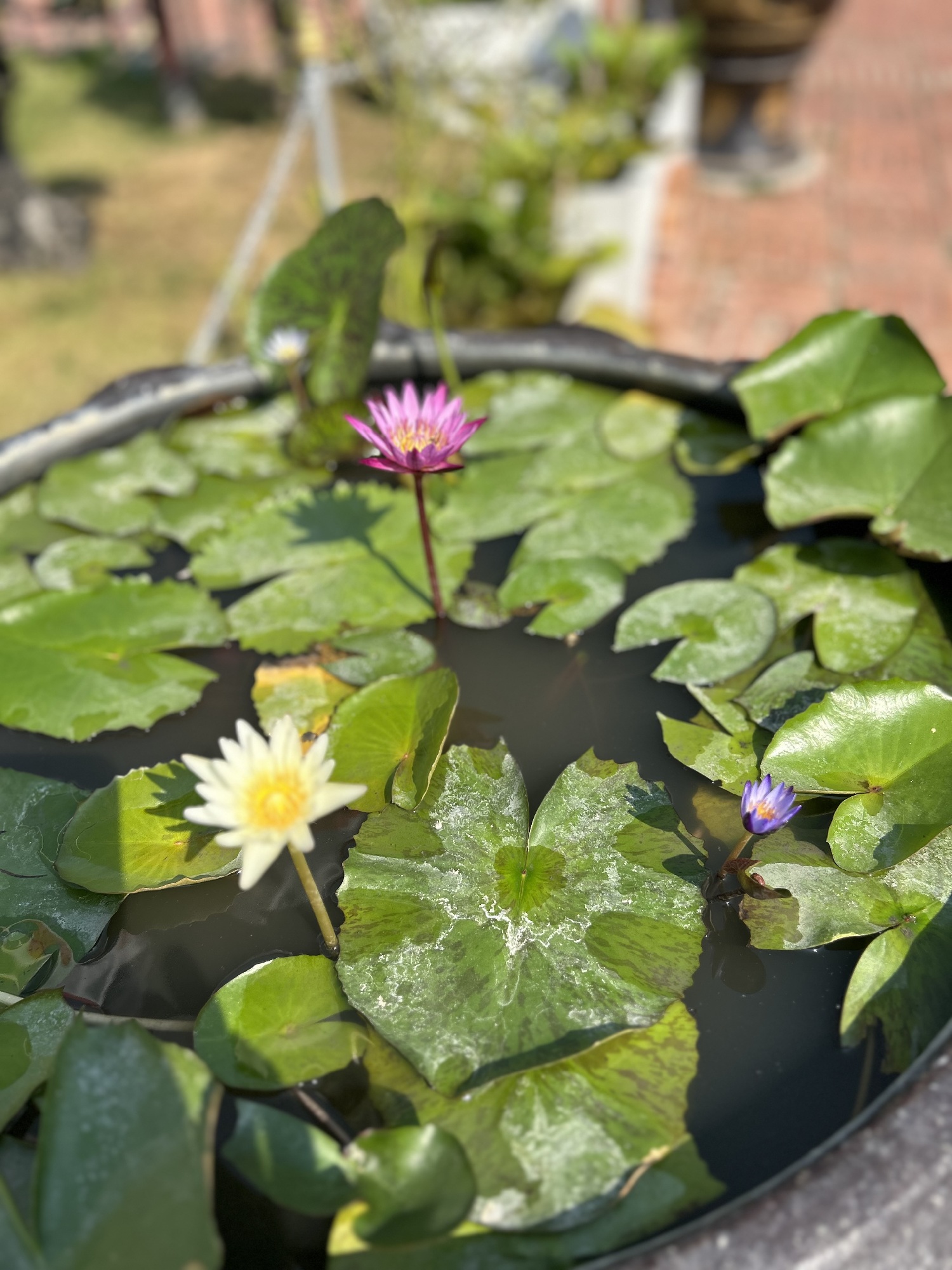 蒸し暑い亜熱帯のタイ。日本では鉢植えで楽しむ観葉植物のドラセナがなんと地植えされてすくすく育っています。水に咲く小さな蓮が可愛らしく。
