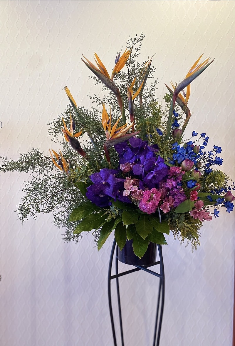 ストレリチアが幸運を願うように晴れやかに。胡蝶蘭の紫色やピンク、ブルーの原色が鮮やか!