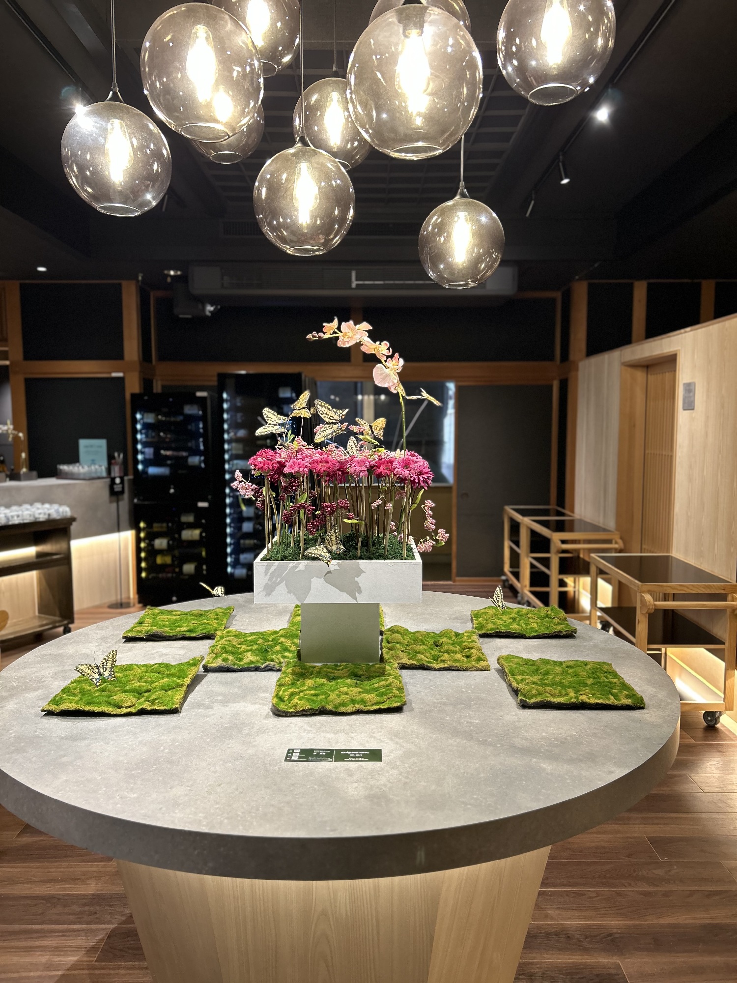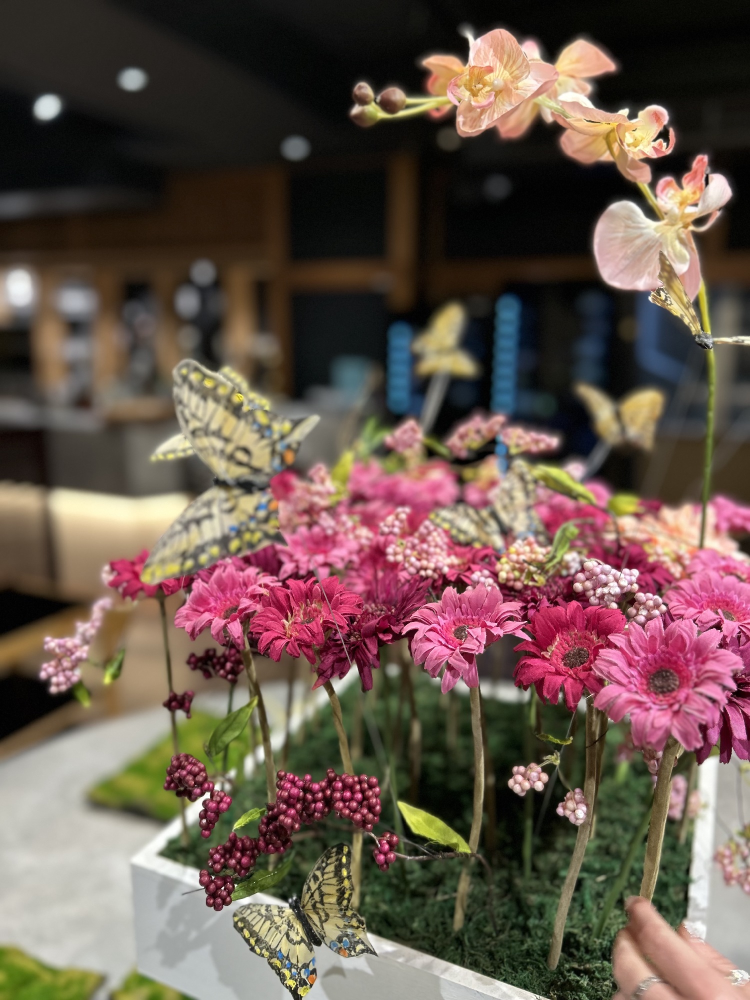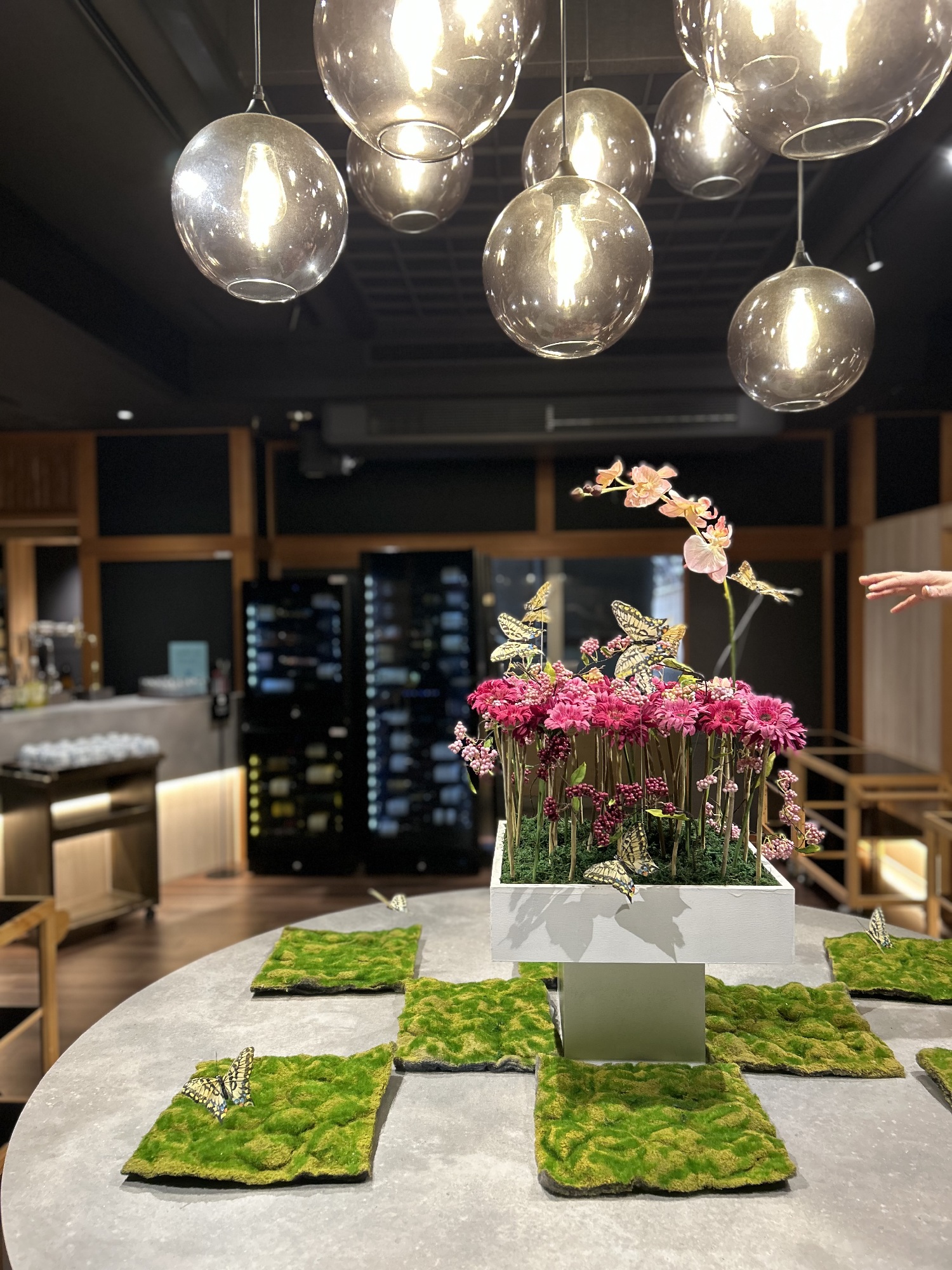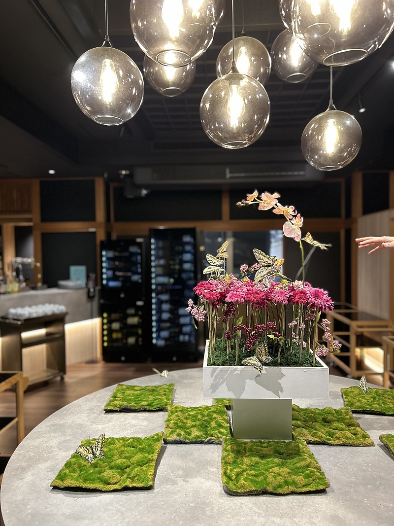 宇奈月温泉桃源のお食事ラウンジ。素敵に照らされるスペースに春の訪れ。ピンクの春。蝶々が舞う春。お客さまにもスタッフの方々にも喜んでいただけますように。