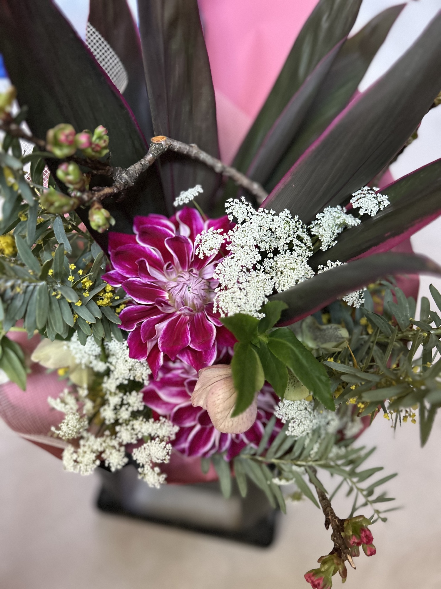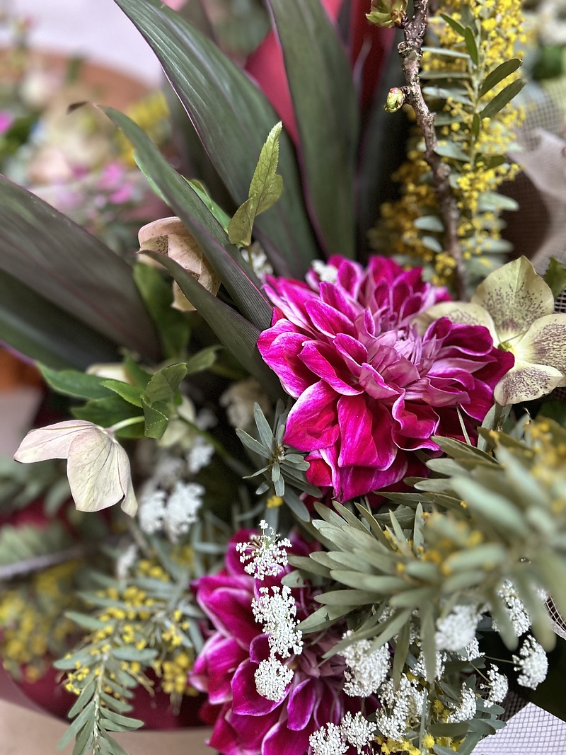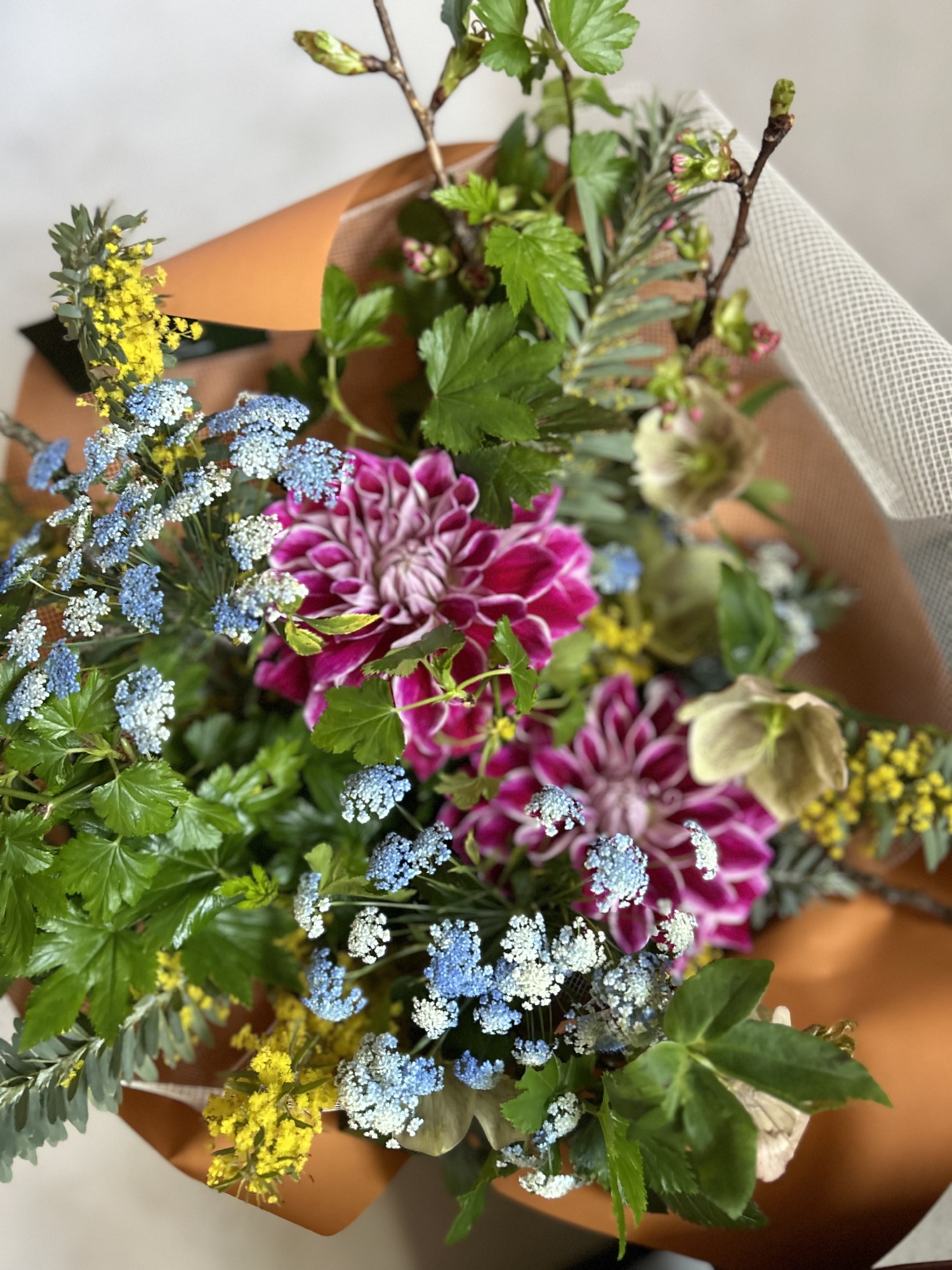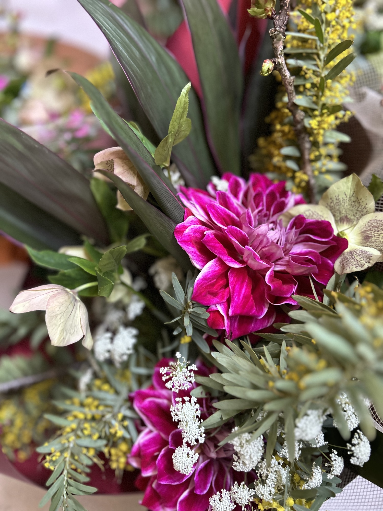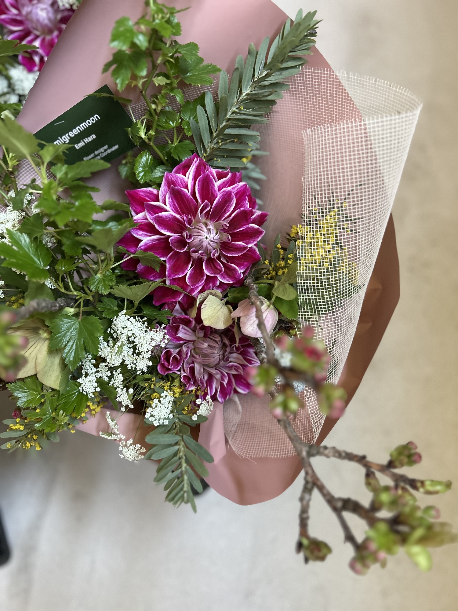 大輪の美しいダリア。桜の枝とレースカラーやミモザ。ふわっとした春の中の大輪のダリアは一層華やか。