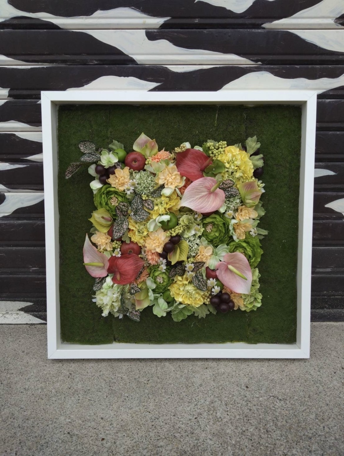 開院祝いの壁面飾り。フレームをご提案しました。アンスリウムと果物や実物とお花でグリーンイエローレッドの明るく清潔感もあるデザインに。