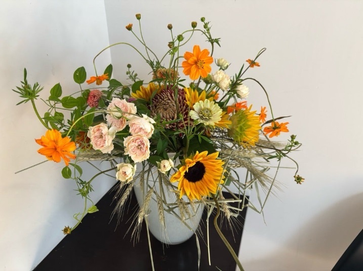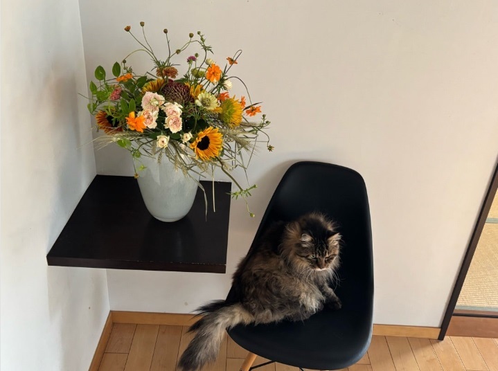 スペシャルレッスンにて阿部喜恵先生のお稽古で作った花束です。モデル猫の寿くんと。素敵でしょーー。作者はYちゃんです。