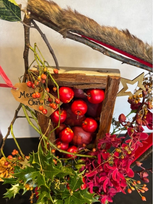 柊、ノイバラ、姫りんご、松笠、杉の皮、茶色のファー……