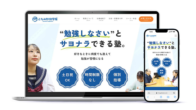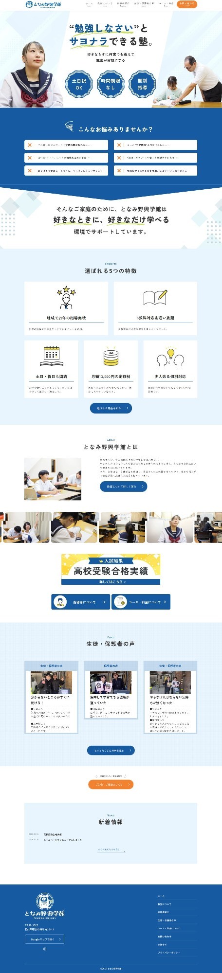 先生と生徒が共に学ぶリアルな教室風景をトップページに大きく使用し、塾の信頼感と温かい雰囲気を明確に伝えるとともに、保護者や生徒からの手書きの感想・写真コンテンツにより、先生の人柄と実績をダイレクトに訴求しました。また、最初に表示される画面(ファーストビュー)では、先生と生徒の写真をメインに配置することで、訪問者がすぐに塾の「安心感」と「特長」を把握し、不安を解消できるように工夫しています。