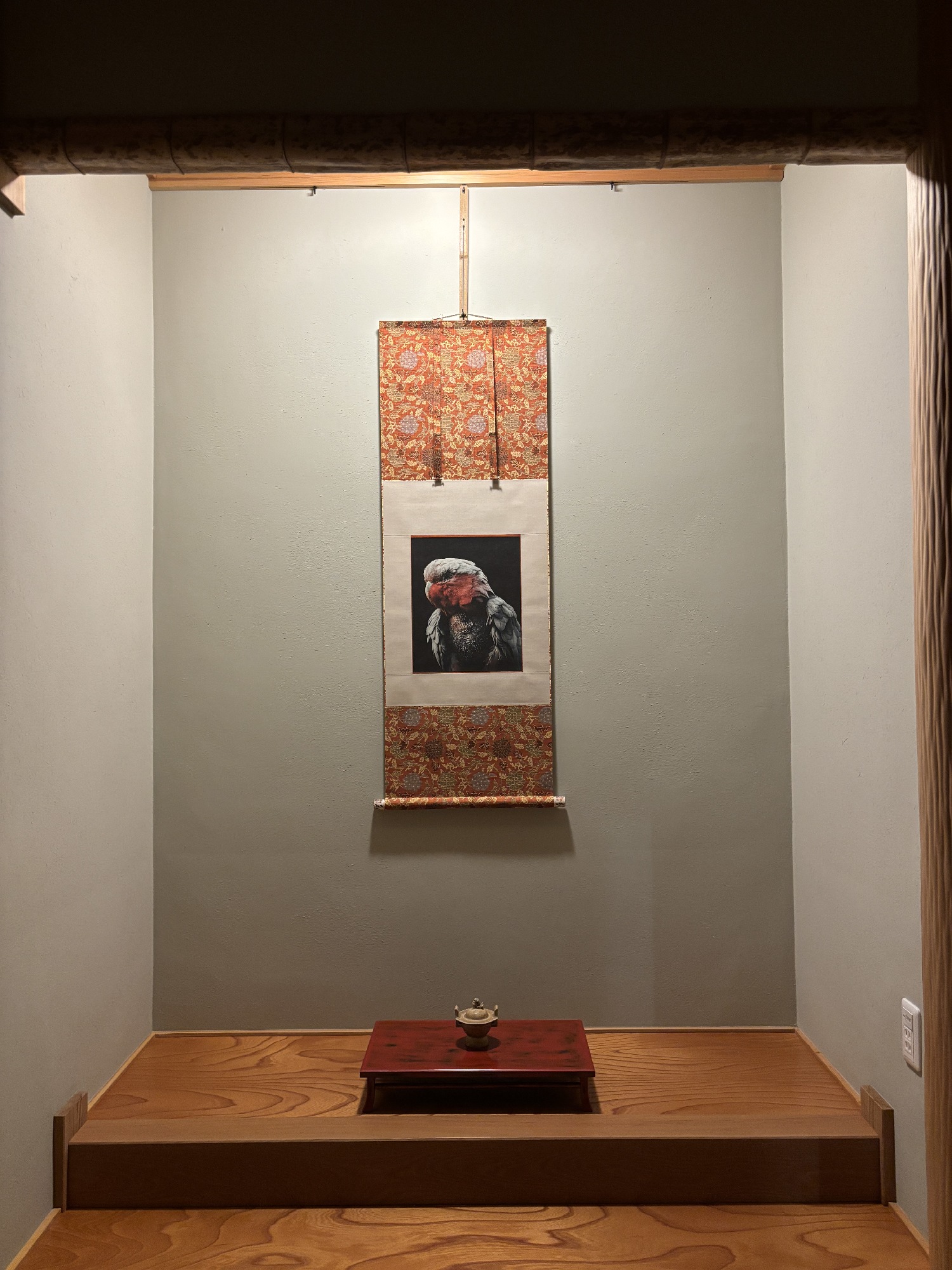 作品の説明を少しすると、インコの写真を和紙に印刷して掛軸に仕立てたものです。