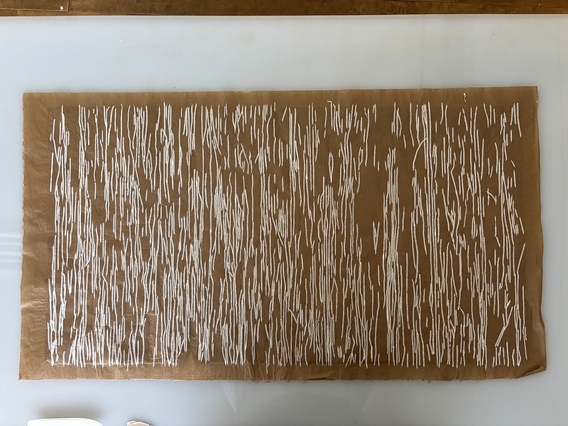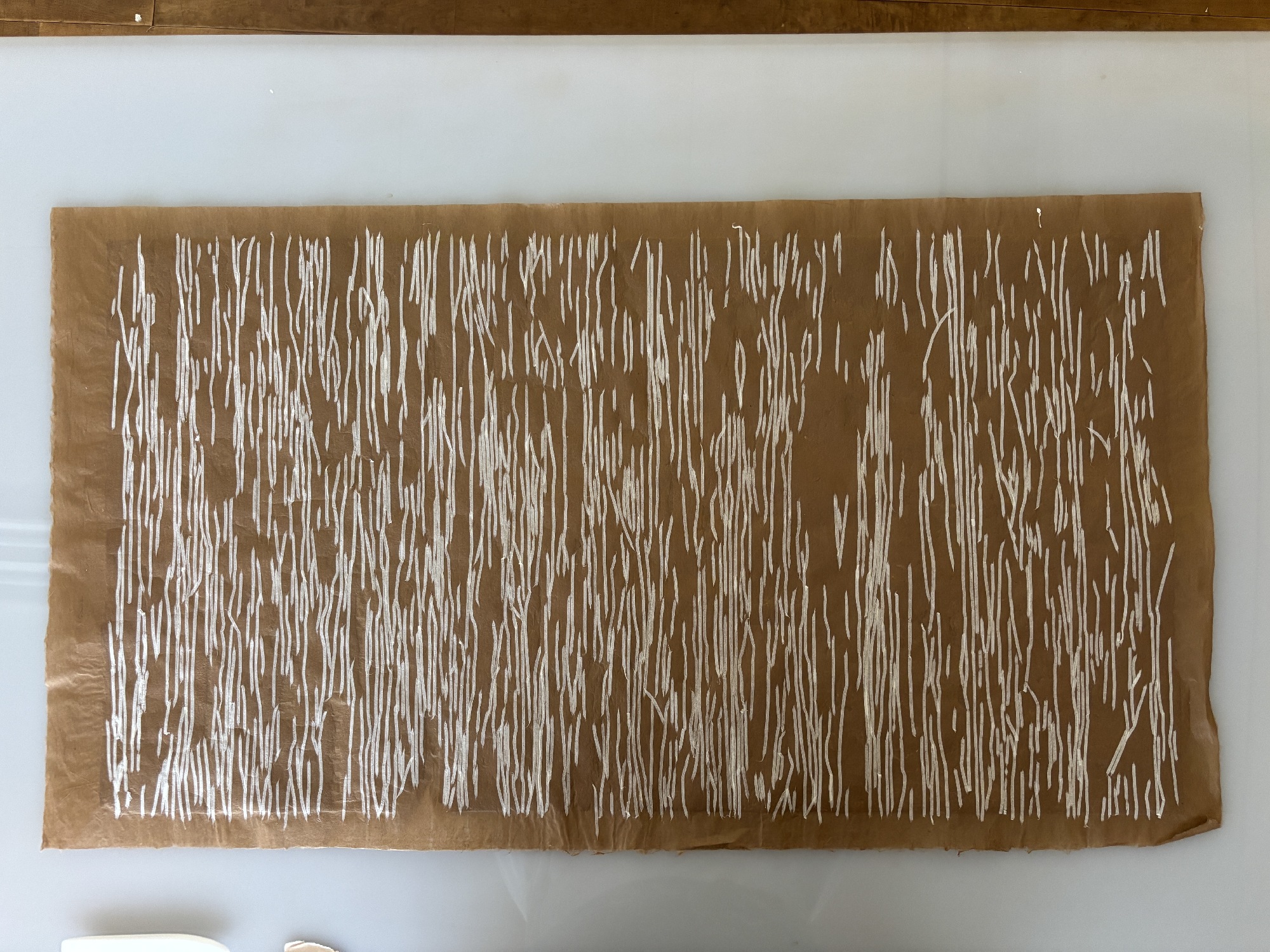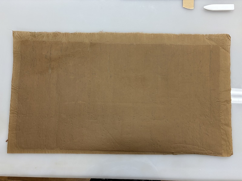 一度折れたところや亀裂部分は再び折れやすいため、裏から細く切った和紙を張って補強します。(折れ伏せと言います。)