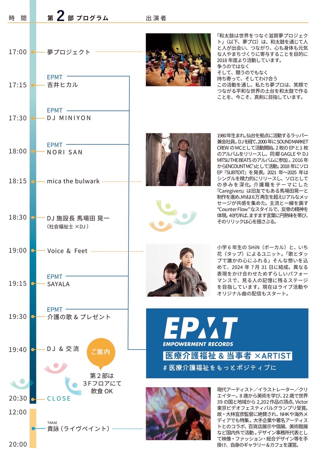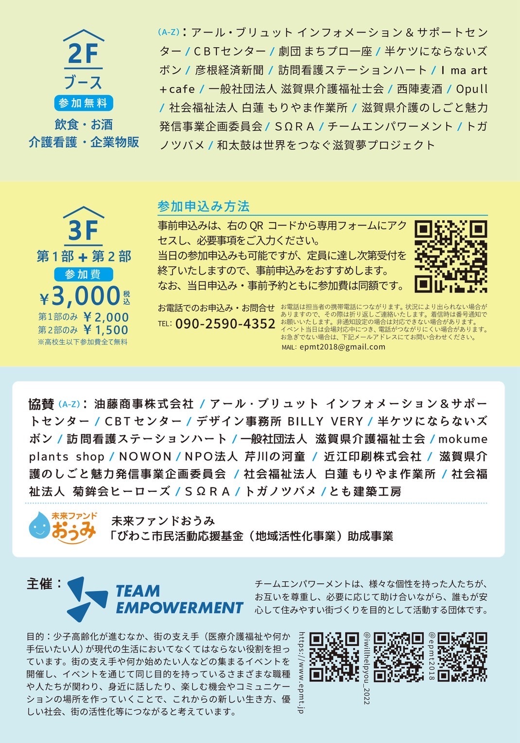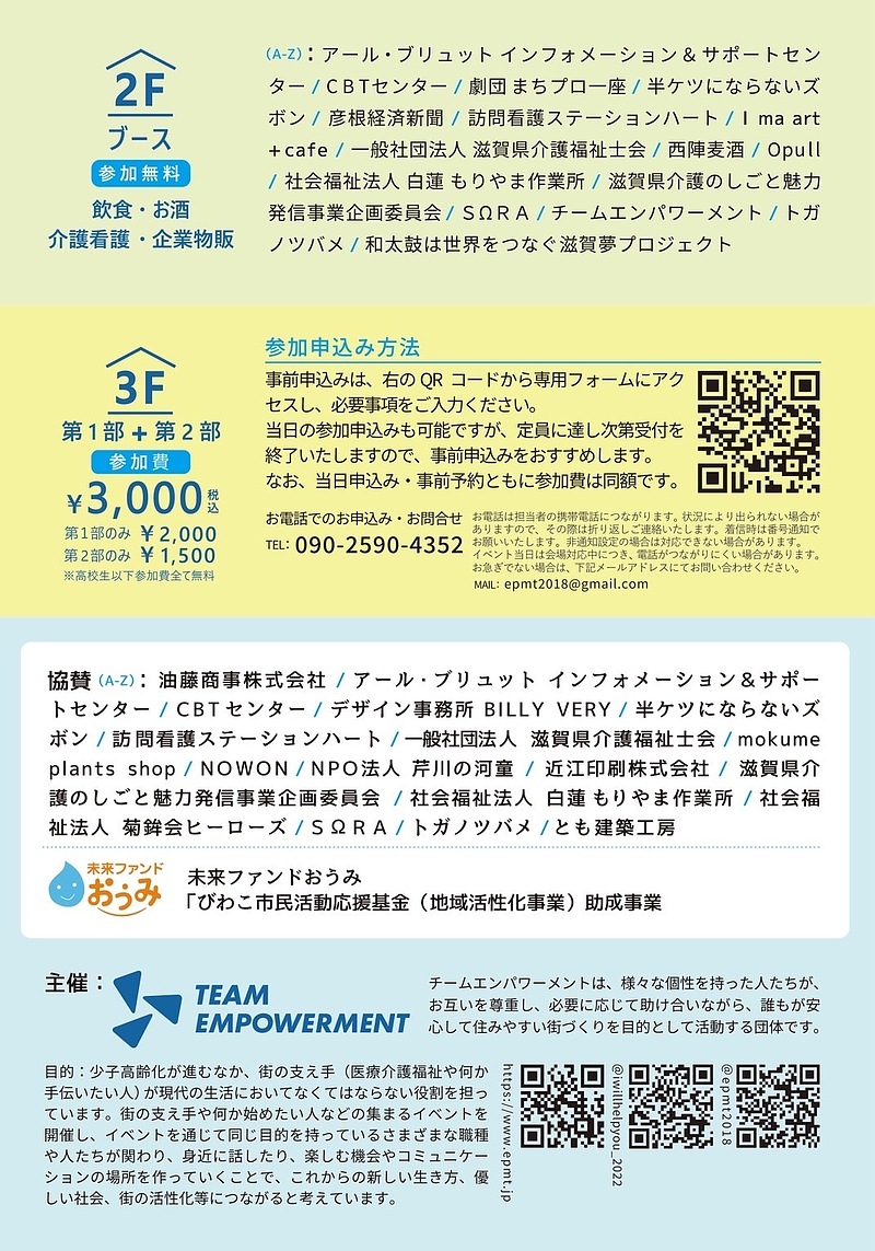 協賛:油藤商事株式会社様/アール・ブリュット インフォメーション&サポートセンター様/CBTセンター様/デザイン事務所 BILLY BILLY様/半ケツにならないズボン様/訪問看護ステーションハート様/一般社団法人 滋賀県介護福祉士会様/mokume plants shop様/NOWON様/NPO法人 芹川の河童様/近江印刷株式会社様/滋賀県介護の仕事魅力発信事業企画委員会様/社会福祉法人 白蓮 もりやま作業所様/社会福祉法人 菊鉾会ヒーローズ様/SΩRA様/トガノツバメ様/とも建築工房様 BIG UP!!