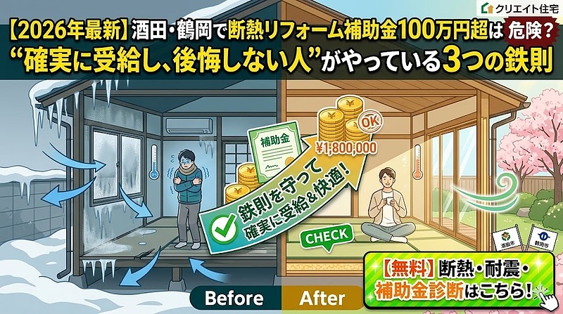 なぜ、国や自治体(酒田市・鶴岡市)の潤沢な補助金制度を使いながら、後悔する人が後を絶たないのか。永年リフォーム・リノベーション工事を行ってきたクリエイト住宅が、「補助金を確実に受給し、かつ劇的に暖かい家を手に入れるための3つの鉄則」を公開します。
