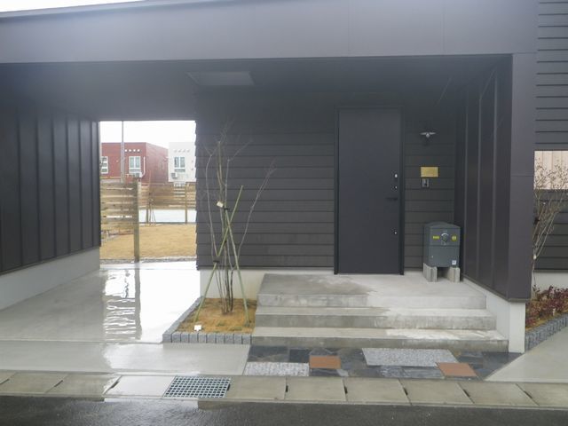 玄関前のアプローチは白御影の敷石とクラストブラック石の乱張りという