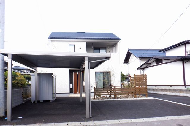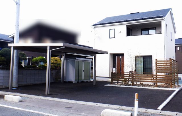 2台用のカーポートを設け、その脇には物置を設置しました。