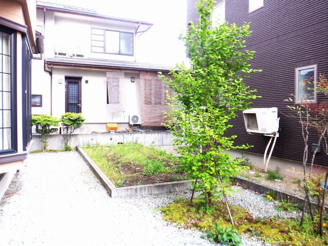 外壁だけを借景して和風とも洋風ともとれる庭になりました。