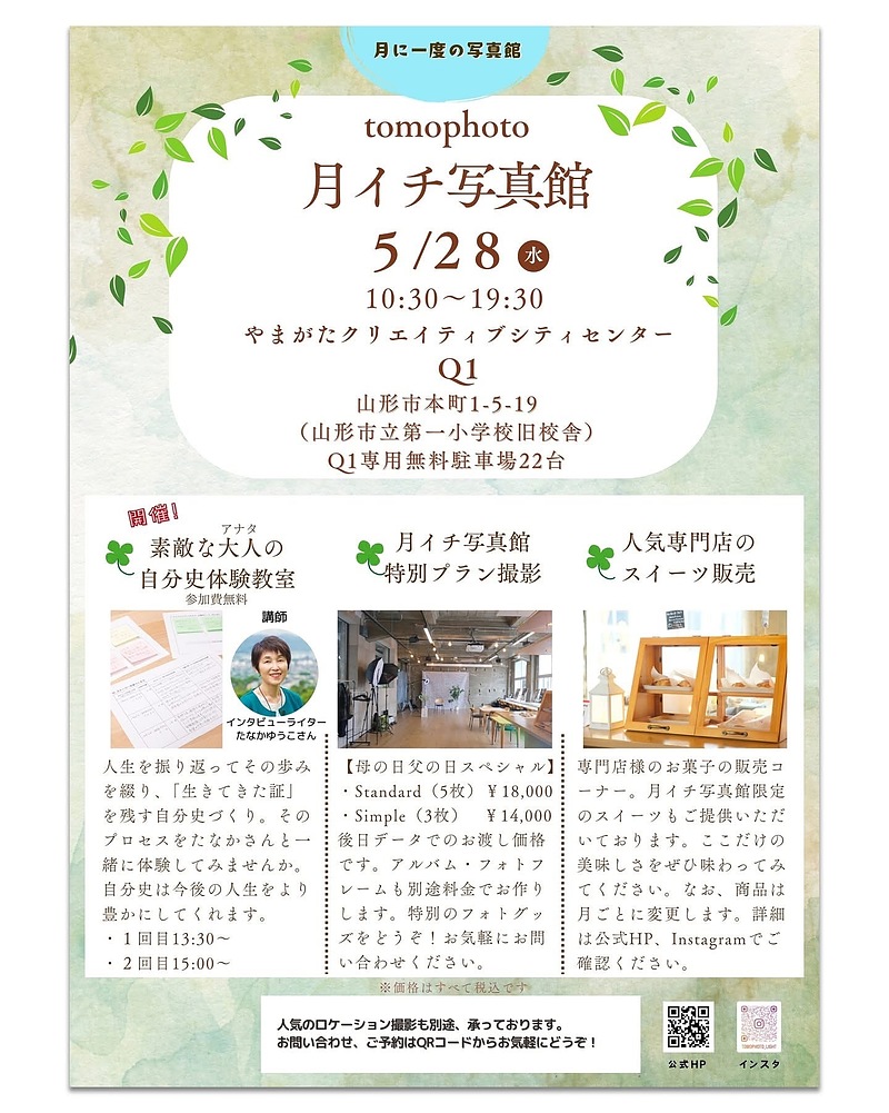 2)写真館5月6月は父の日母の日スペシャルです。Q1のちょっとレトロな雰囲気でおしゃれな写真を撮りませんか。どうぞお父さまお母さまとごいっしょにお越しください。