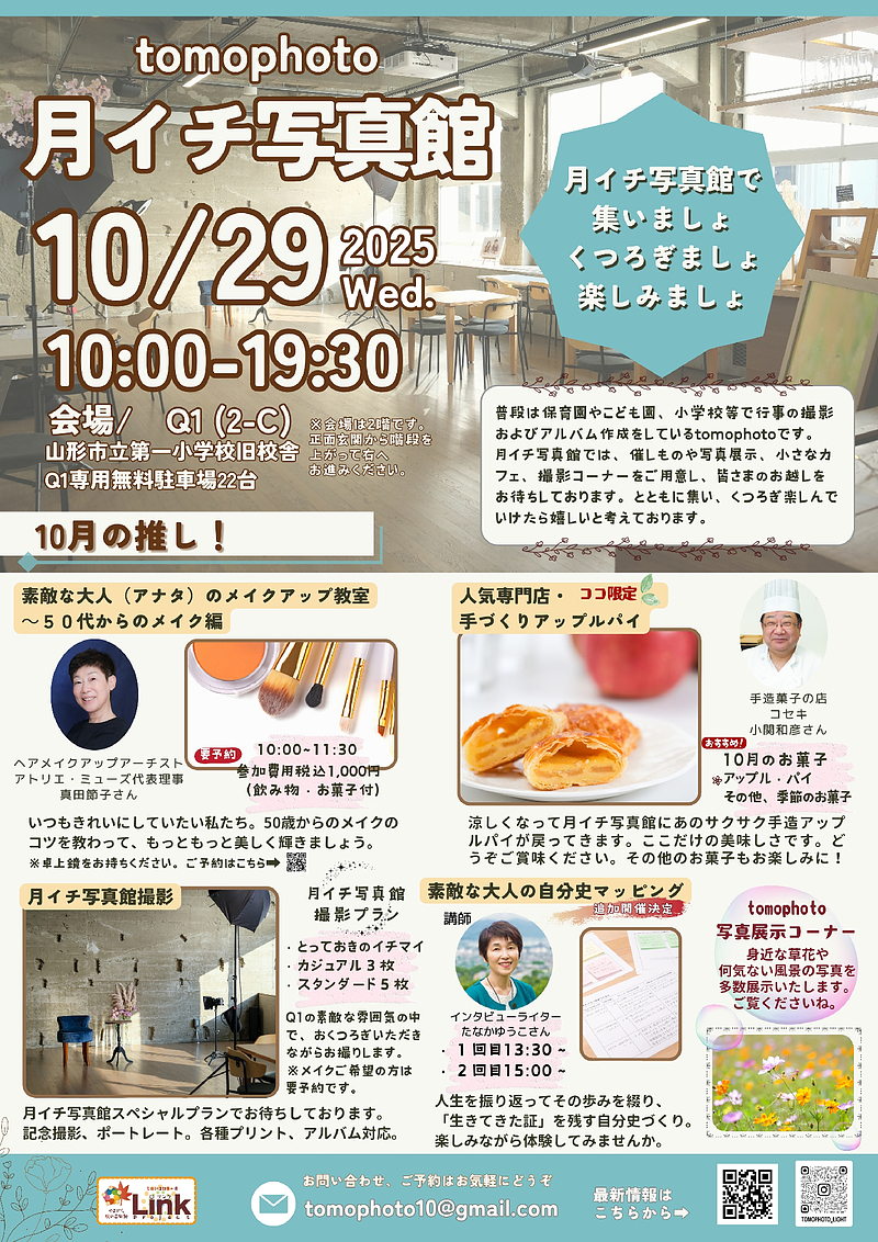 月に一度の写真館tomophoto【月イチ写真館】10月開催のお知らせです。10月は29日水曜日開催。山形市のLink Project参加イベントです。