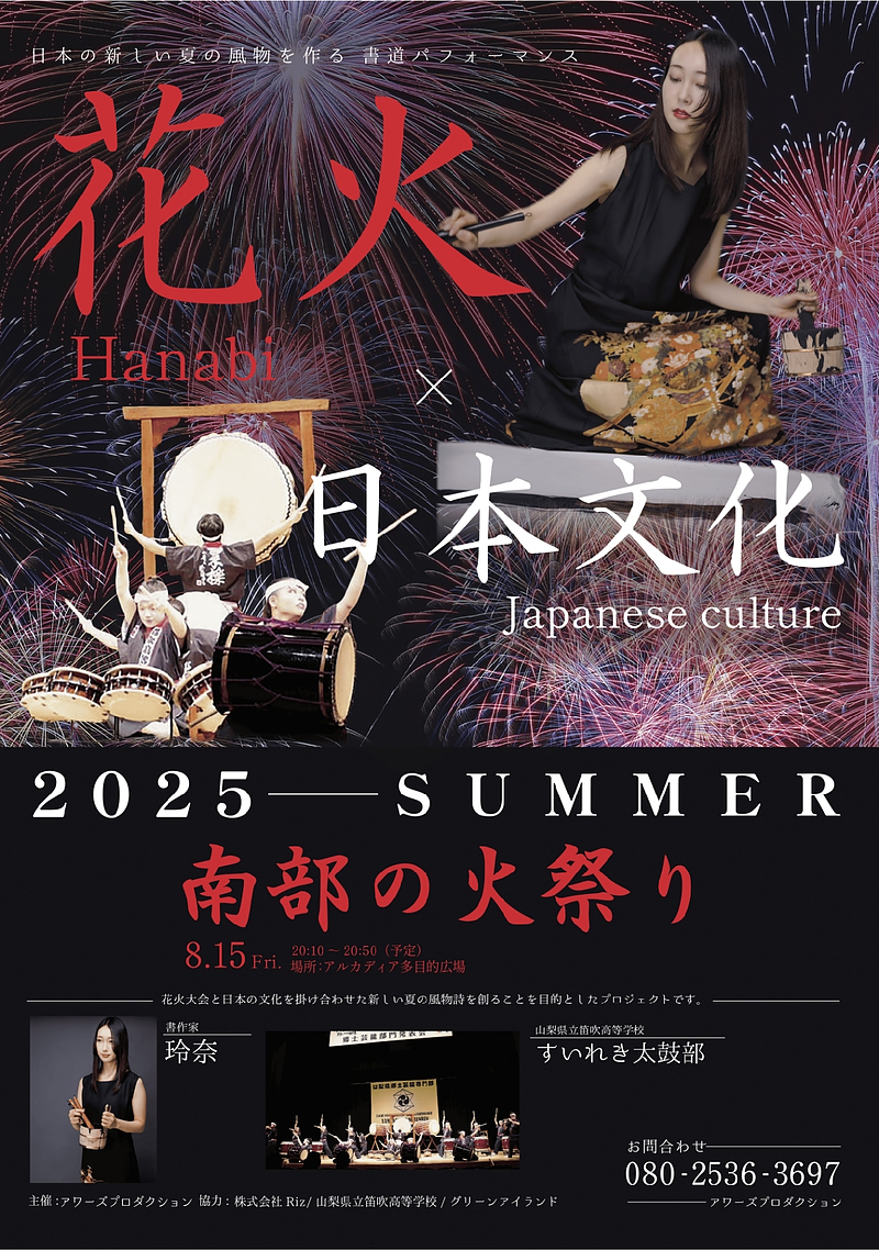 今年も夏の夜空を熱く彩る「南部の火祭り」にて、書作家 玲奈による圧巻の書道パフォーマンスが開催されることが決定しました!