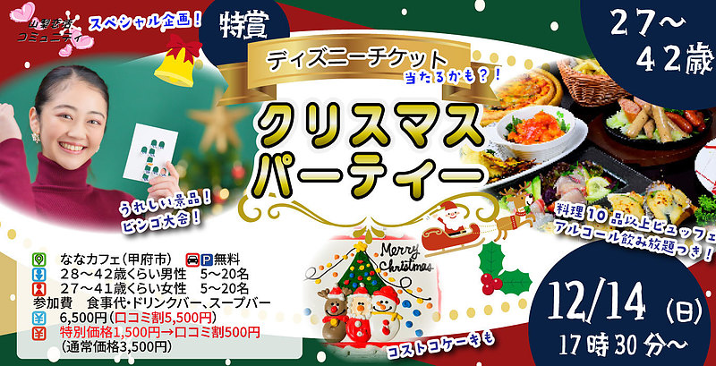 【男性28~42歳、女性27~41歳】【ディズニーチケットが当たる?!】コストコ超巨大クリスマスケーキ&ビンゴ大会!クリスマスパーティ|12月14日(日)17時30分~開催