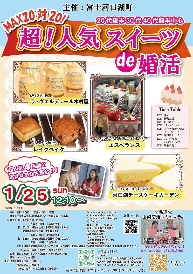 1月25日(日)12時10分~【富士河口湖町主催】20代後半30代40代前半中心 MAX20対20!最大40人!超人気スイーツde婚活