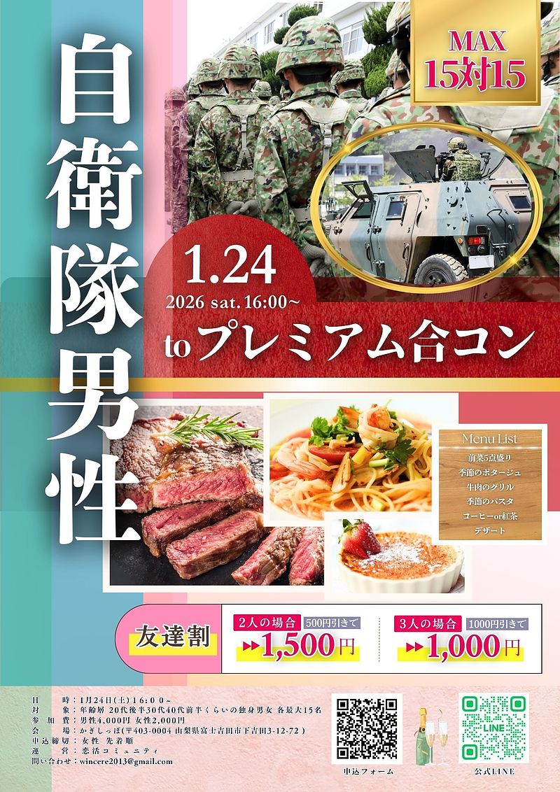 山梨富士吉田市|20代割&友達割あり!自衛隊男性プレミアム合コン|MAX15対15|2026年1月24日(土)16時~開催